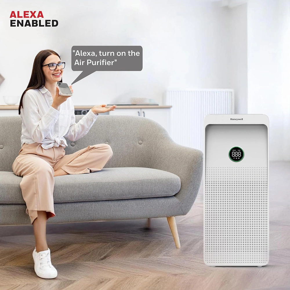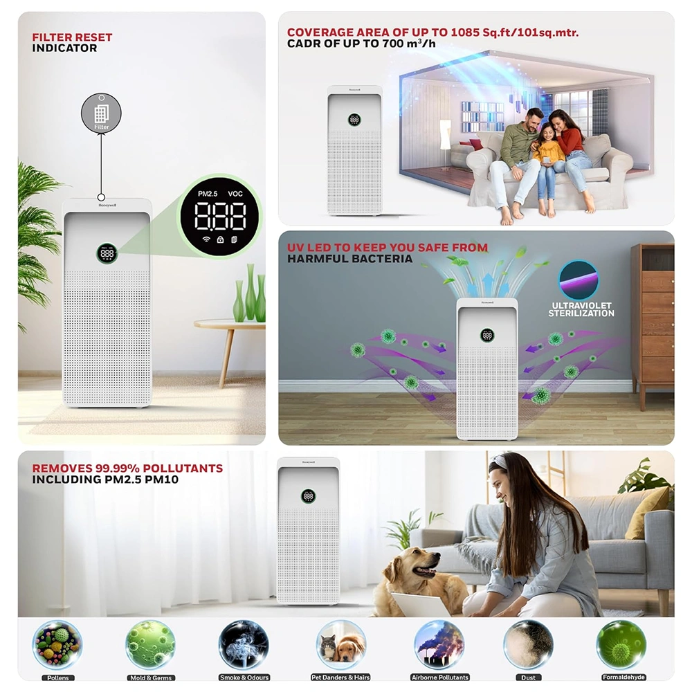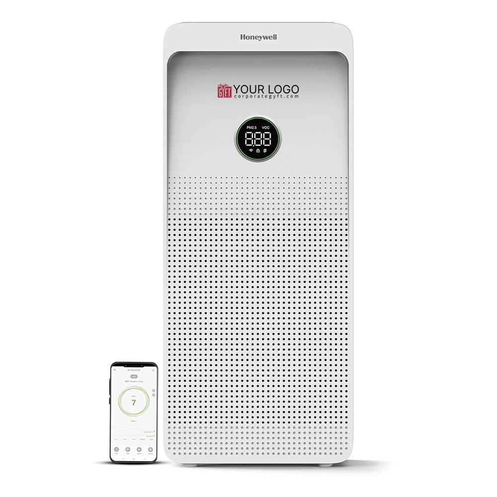Designed for high-performance purification in large indoor environments, the Honeywell air purifier delivers powerful and efficient air cleaning for spaces up to 1085 sq ft with an advanced purification cycle that refreshes air every 12 minutes, supported by a high CADR of 700 m³/h for particulate matter and 136.7 m³/h for formaldehyde. A 3-in-1 compound filtration system with H13 HEPA works alongside UV LED purification to capture fine dust, allergens, harmful pollutants and bacteria, while real-time PM2.5 monitoring with a clear 3-color digital display keeps air quality status instantly visible. Featuring three fan speeds with auto, sleep and turbo modes, the purifier adapts intelligently to changing air conditions and ensures quiet operation with noise levels as low as 23 dB at low speed and 56 dB at high speed. Built for reliable daily use, the unit operates at 70W with 220–240V and 50/60 Hz input, includes a filter reset indicator for timely maintenance, and comes in a sturdy 320 × 320 × 745 mm design weighing 9.7 kg. Dedicated branding space allows custom logo and design printing, making it suitable for homes, offices, conference rooms, clinics and premium corporate gifting.