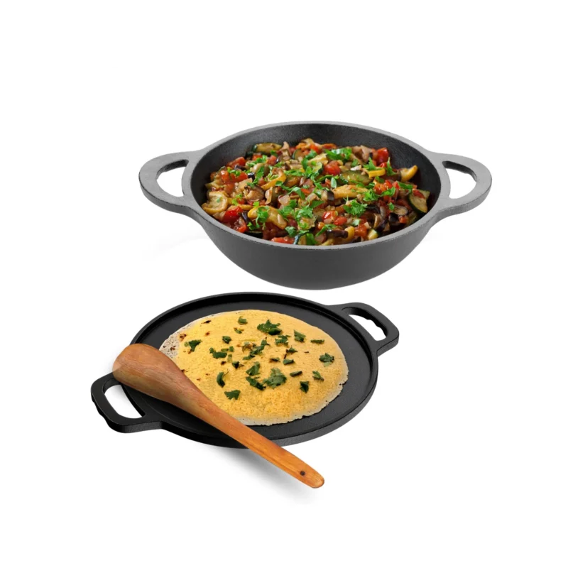 The lifelong cast iron dosa tawa and kadhai set is designed to bring authentic taste and durability to everyday cooking. The set includes a 30 cm dosa tawa, a 24 cm kadhai, and a wooden spatula, making it perfect for preparing dosas, uttapams, chapatis, curries, and more. Crafted from high-quality cast iron, both cookware pieces are pre-seasoned to offer a naturally non-stick surface that improves with use. Compatible with gas and induction stoves, they ensure even heat distribution for consistent results while being completely non-toxic and teflon free. Built to last, this versatile set combines traditional cooking with modern convenience, making it a healthy and reliable choice for any kitchen.