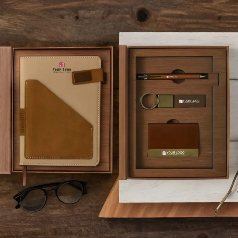 Executive gift set thoughtfully curated with a sleek metallic pen, a premium card holder with an elegant gold accent finish, a leatherette diary featuring a stylish flap closure, and a matching keychain detailed with gold-plated accents. The precisely sized 148 × 210 × 20 mm notebook ensures a perfect balance of portability and writing comfort. Sophisticated wooden-style gift box packaging enhances the premium presentation and protects each item securely. Refined design elements create a luxurious visual appeal suitable for professional gifting. Smooth coordination of metallic and leatherette textures adds elegance to everyday essentials. Custom branding space allows logo and design printing for impactful brand visibility, making it ideal for corporate gifting, festive occasions and executive recognition.