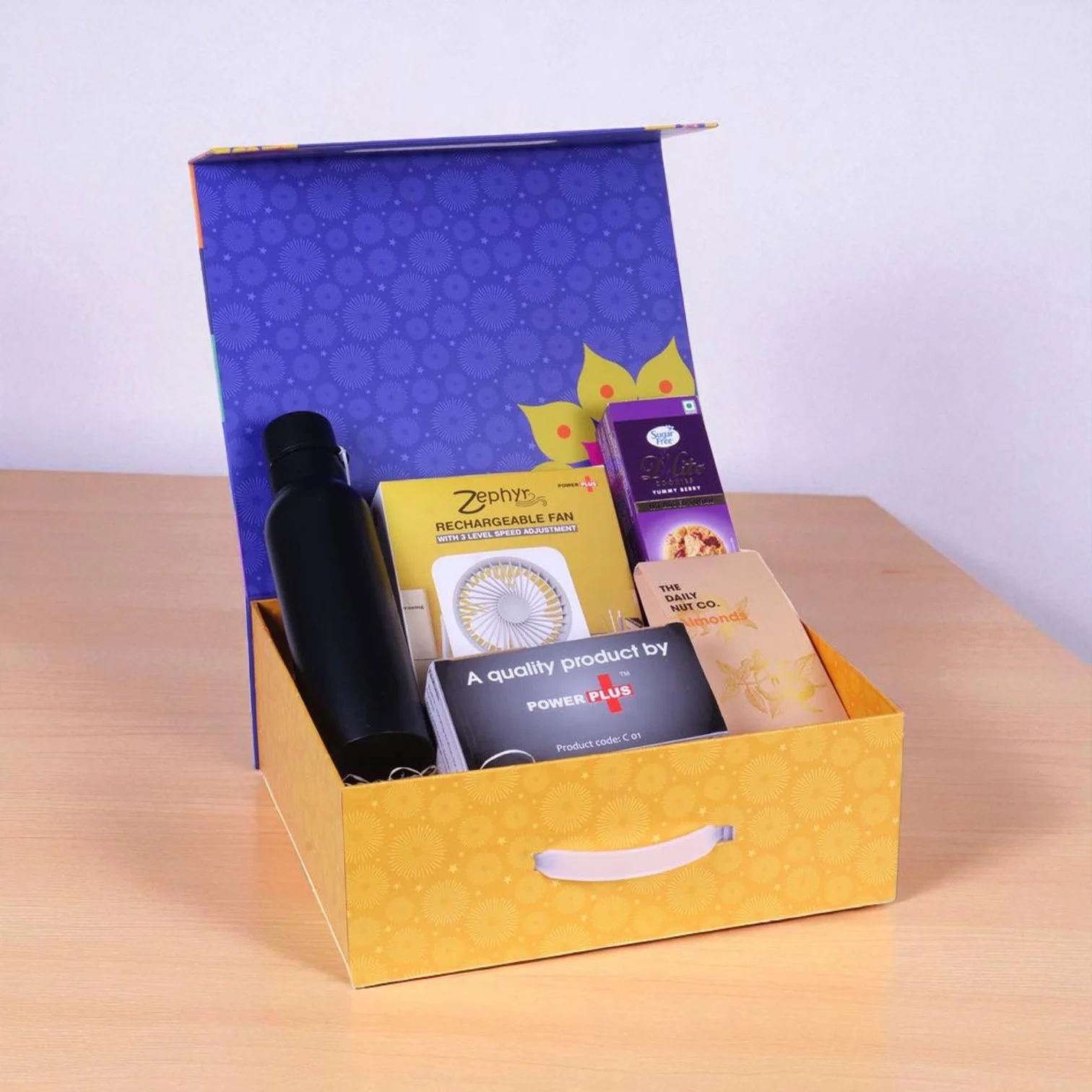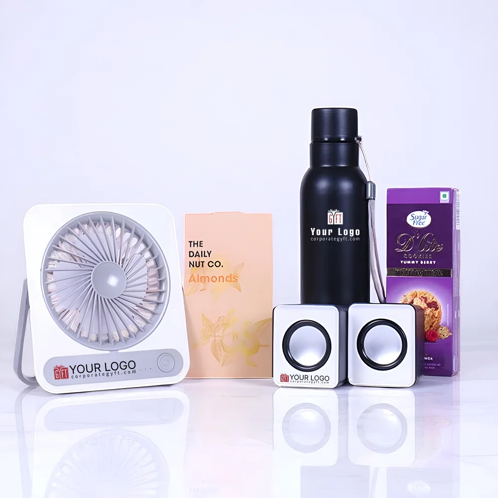 Celebrate every special moment with this curated five-piece festive gift set, thoughtfully designed to delight and impress. It includes a vibrant 750ml stainless steel bottle, a compact wired mini speaker, a rechargeable three-speed table fan, sugarfree D’Lite cookies, and a gourmet almond gift pack. All items come beautifully arranged in a magnetic gift box with a convenient handle, perfect for gifting during festivals, corporate events, or personal celebrations. This versatile set combines practicality and indulgence, making it an ideal choice for any occasion.