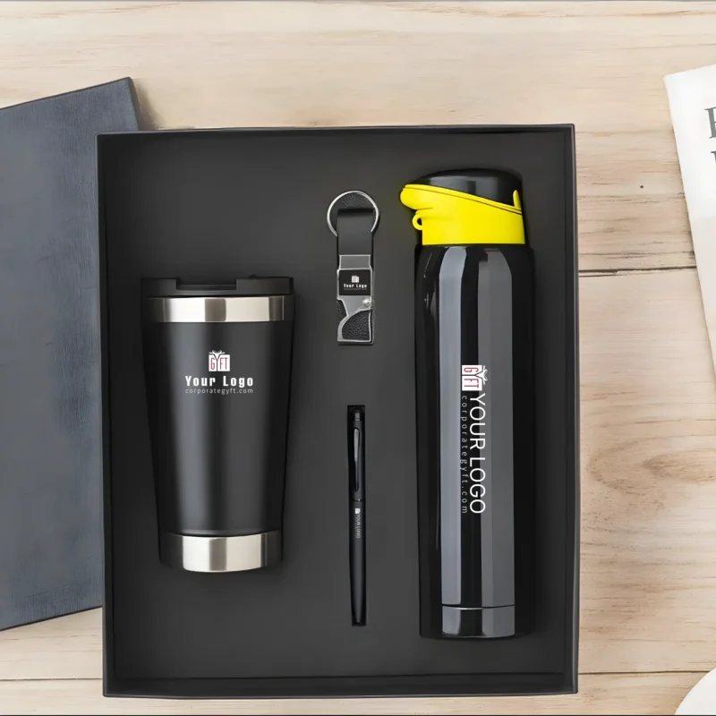 Crafted for impactful corporate gifting, this premium set brings together four daily-use essentials in one elegant box. A stainless steel bottle with a flip-top lid, an insulated travel mug, a metal keychain, and a black pen offer a perfect blend of style and practicality for professionals. Each item supports custom logo printing, making the set ideal for brand visibility and memorable presentations. Designed for executives, clients, and teams, it is ideal for event giveaways, onboarding kits, and festive gifting.