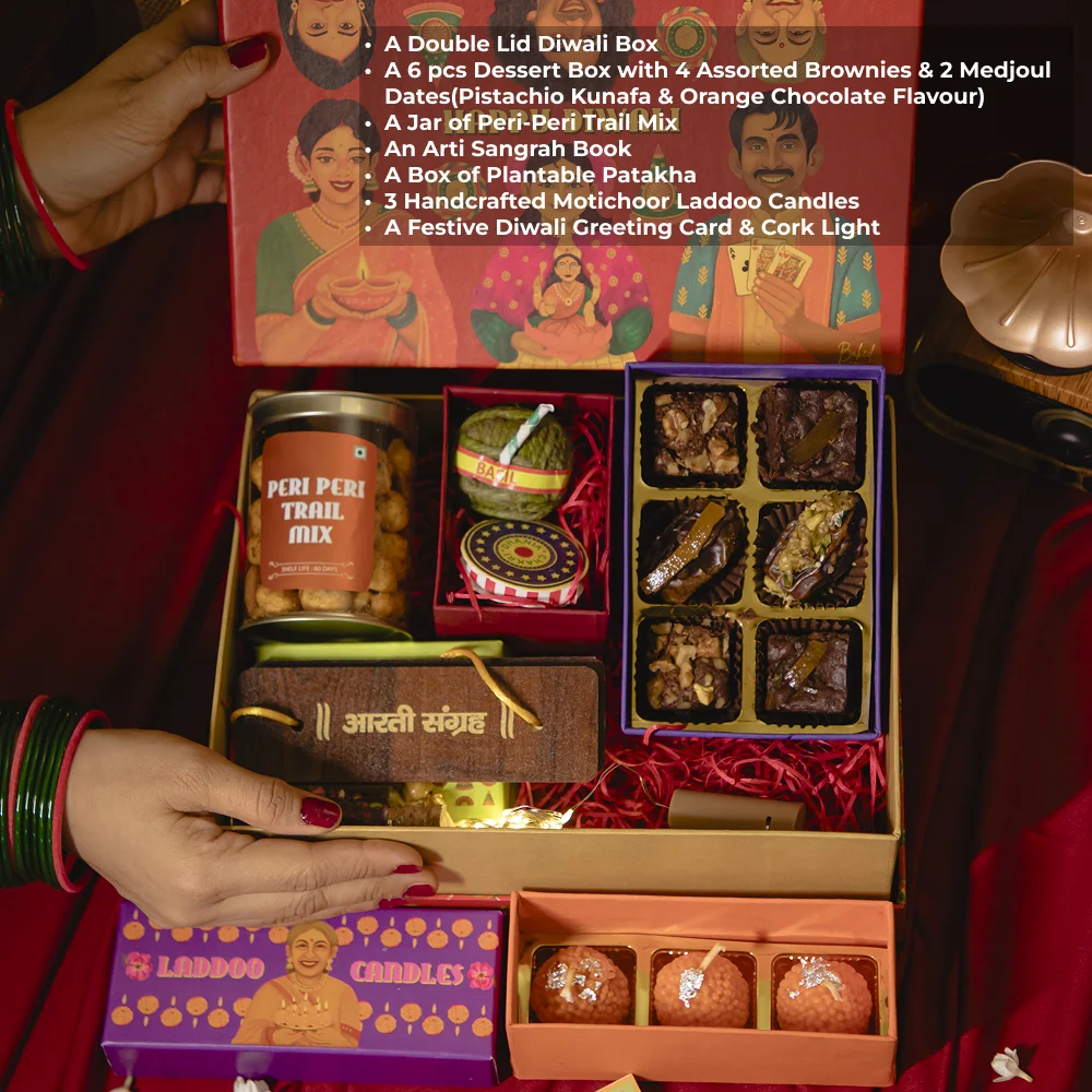 This Diwali gift box is a thoughtfully curated hamper perfect for celebrating the festival of lights with family, friends, or corporate associates. It features a 6-piece dessert box with assorted brownies and Medjoul dates, a jar of peri-peri trail mix, an Arti Sangrah book, a box of plantable patakha, and three handcrafted motichoor laddoo candles. A festive Diwali greeting card with a cork light completes the set, blending indulgence, tradition, and festive charm. Elegantly packaged, this hamper makes a premium gift option to spread joy and appreciation during Diwali.