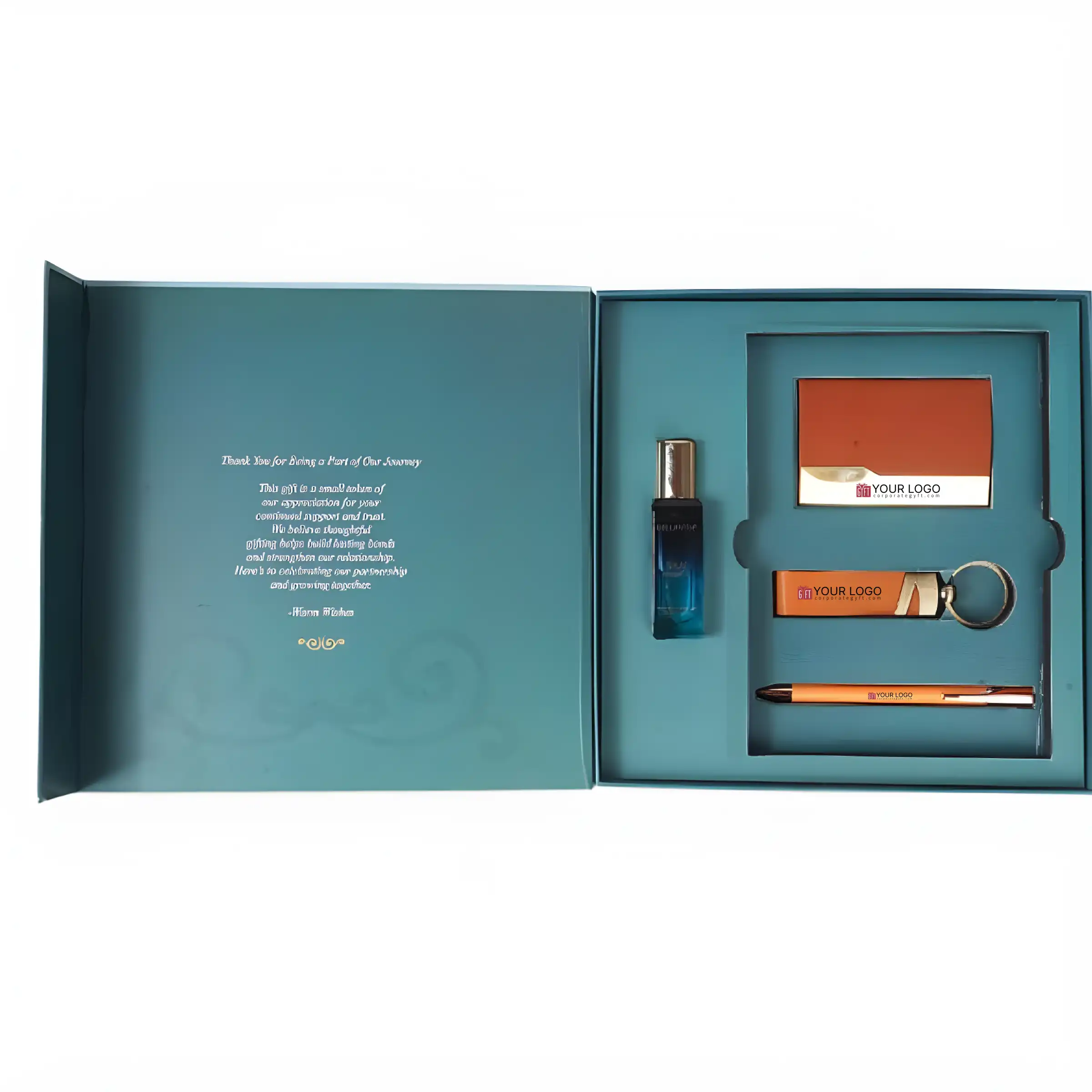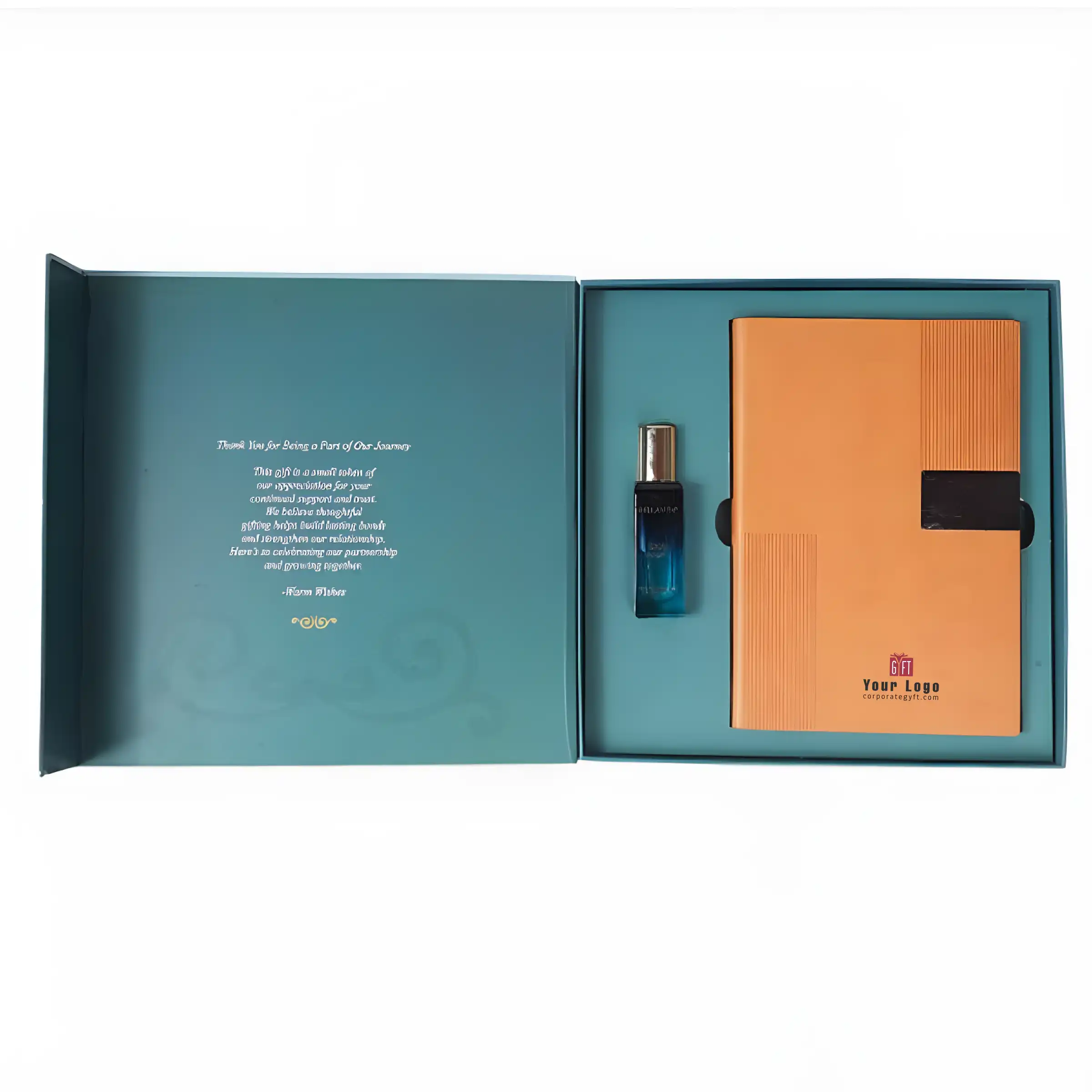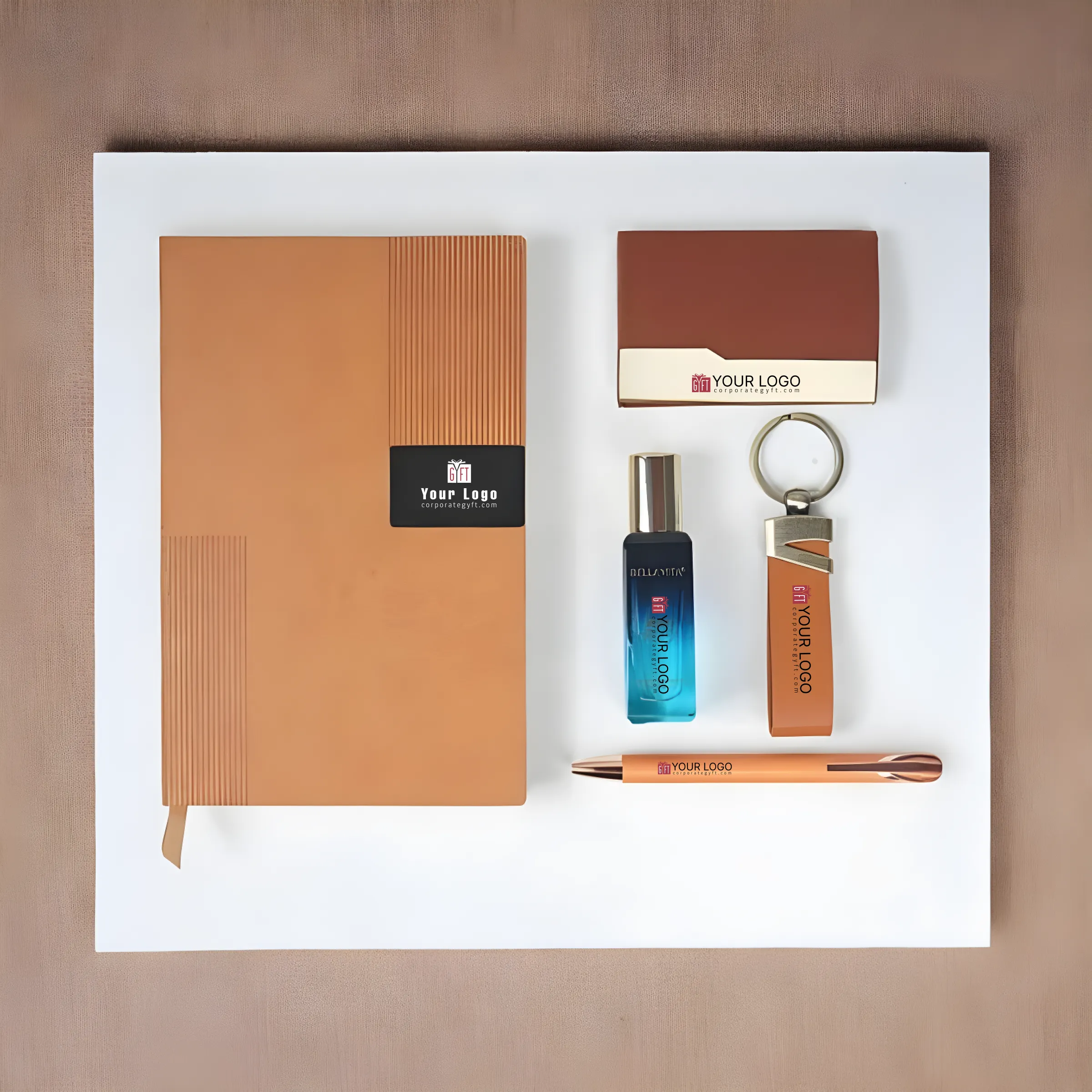 Crafted for a vibrant and modern gifting experience, the Premium Orange Gift Set blends style with functionality. It features a sleek leatherette notebook in a bold orange finish paired with a matching executive pen customizable with name or logo. A durable orange-and-gold card holder and a stylish keychain ring add practical elegance to the set. A luxury perfume bottle enhances its premium appeal with a sophisticated touch. Each item supports company branding and individual name personalization for a more exclusive feel. Packed in a luxury magnetic presentation box, the set is perfectly suited for corporate events and high-value gifting.