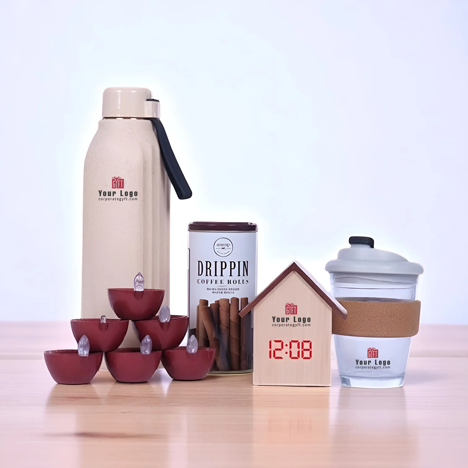 This celebration gift set combines style and functionality with eco-friendly and elegant items perfect for any festive occasion. The insulated bottle keeps drinks hot or cold for hours, while the wooden LED clock adds a warm, charming touch to any space. The glass mug with cork sleeve is both stylish and sustainable, ideal for daily use. The LED light diya set offers a safe, long-lasting festive glow, and the coffee roll sticks provide a delicious crunchy treat to enjoy. All items come beautifully packed in a premium magnetic gift box with a carry handle, making it perfect for gifting.