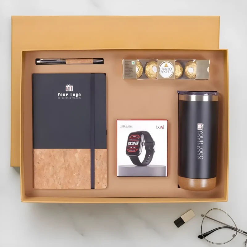 Experience effortless corporate gifting with this premium gift set designed to impress at first glance. It includes a boAt smartwatch for productivity, a smooth-flow pen, an insulated tumbler for temperature-kept beverages, Ferrero Rocher for a delightful treat, and a cork-finish notebook with elastic closure for daily notes. Packed in an elegant luxury box, it offers a refined unboxing experience. With full branding space available, this set is perfect for corporate gifting, employee welcome kits, festive celebrations, conferences and high-value appreciation.