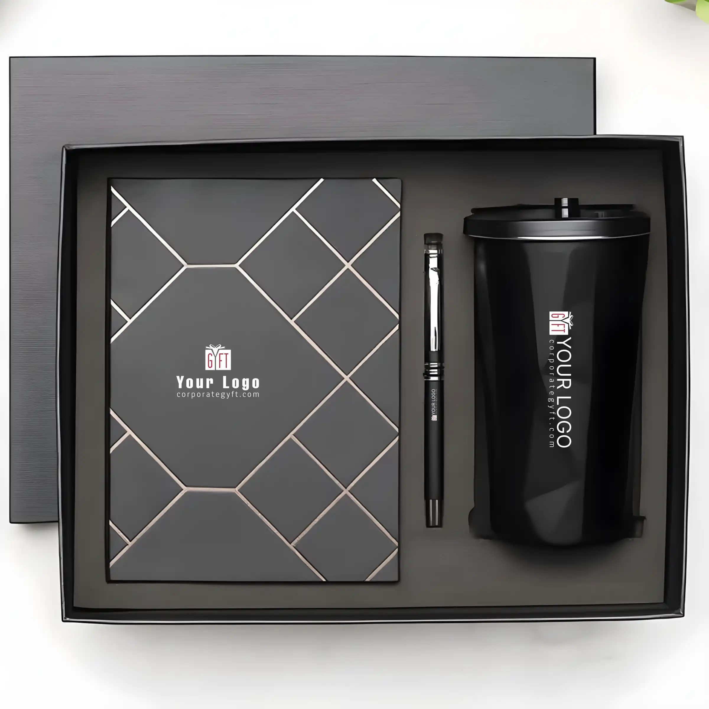 This premium gift set is thoughtfully curated with a smooth-writing pen, a notebook featuring an elegant geometric design, and a matte-black tumbler with a unique faceted finish for a bold modern appeal. Premium packaging enhances presentation and makes it suitable for high-end gifting. Stylish combination of design and daily utility adds lasting value for professional use. Clean matte textures and sharp detailing elevate the overall aesthetic of the set. Custom branding space allows your logo and design to stand out with a refined finish. Ideal choice for corporate gifting, executive rewards, and festive gifting needs.