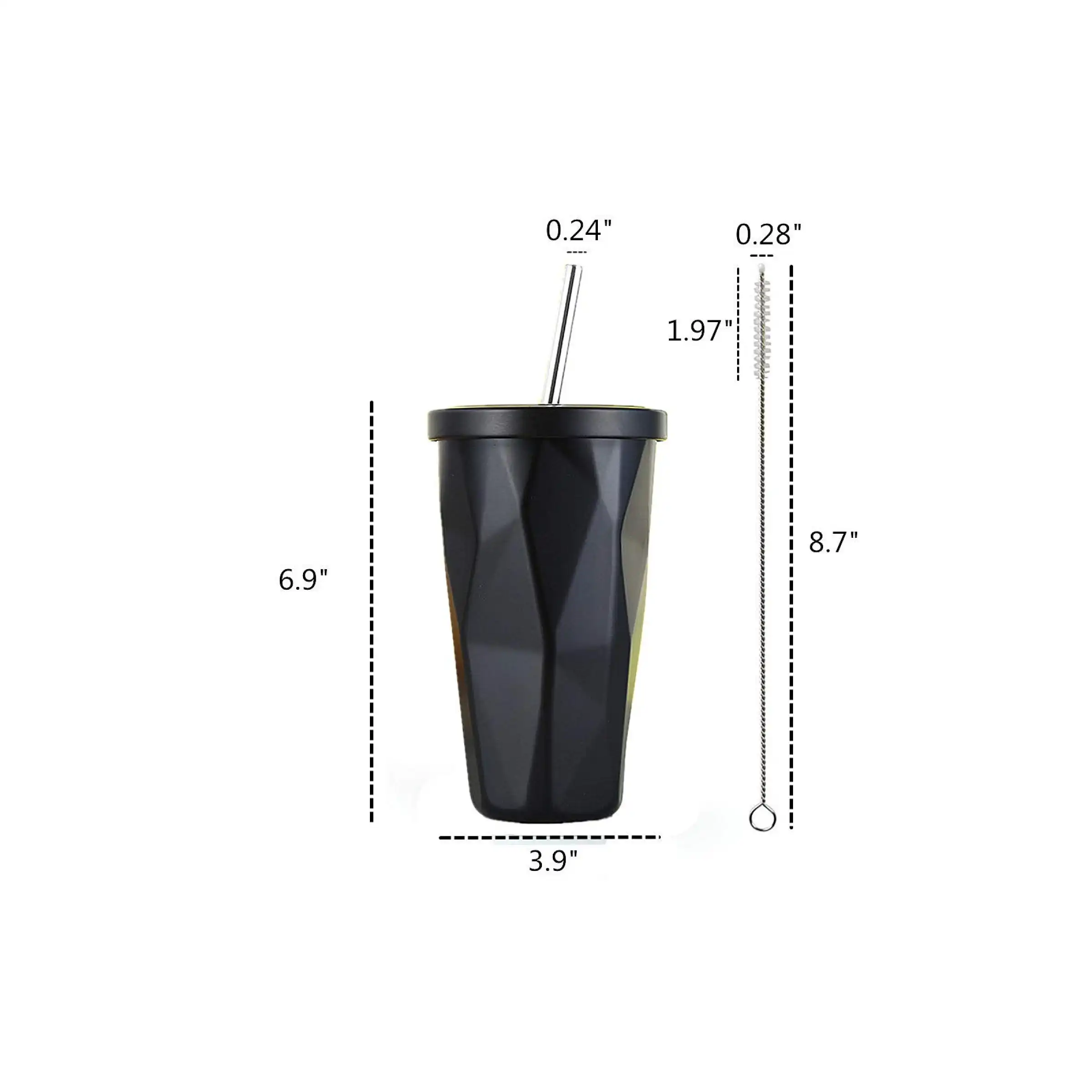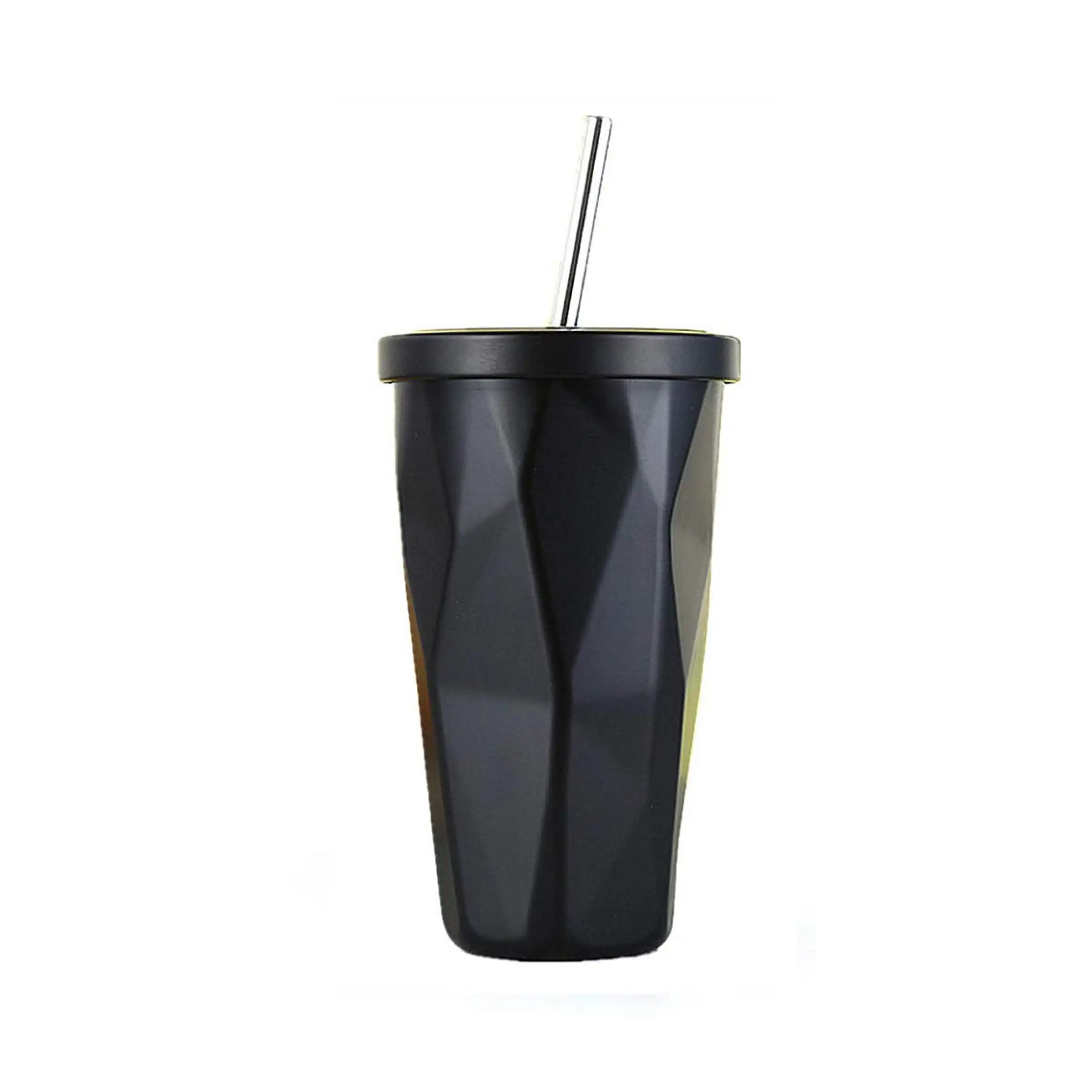 - Matte-black tumbler with unique faceted finish
