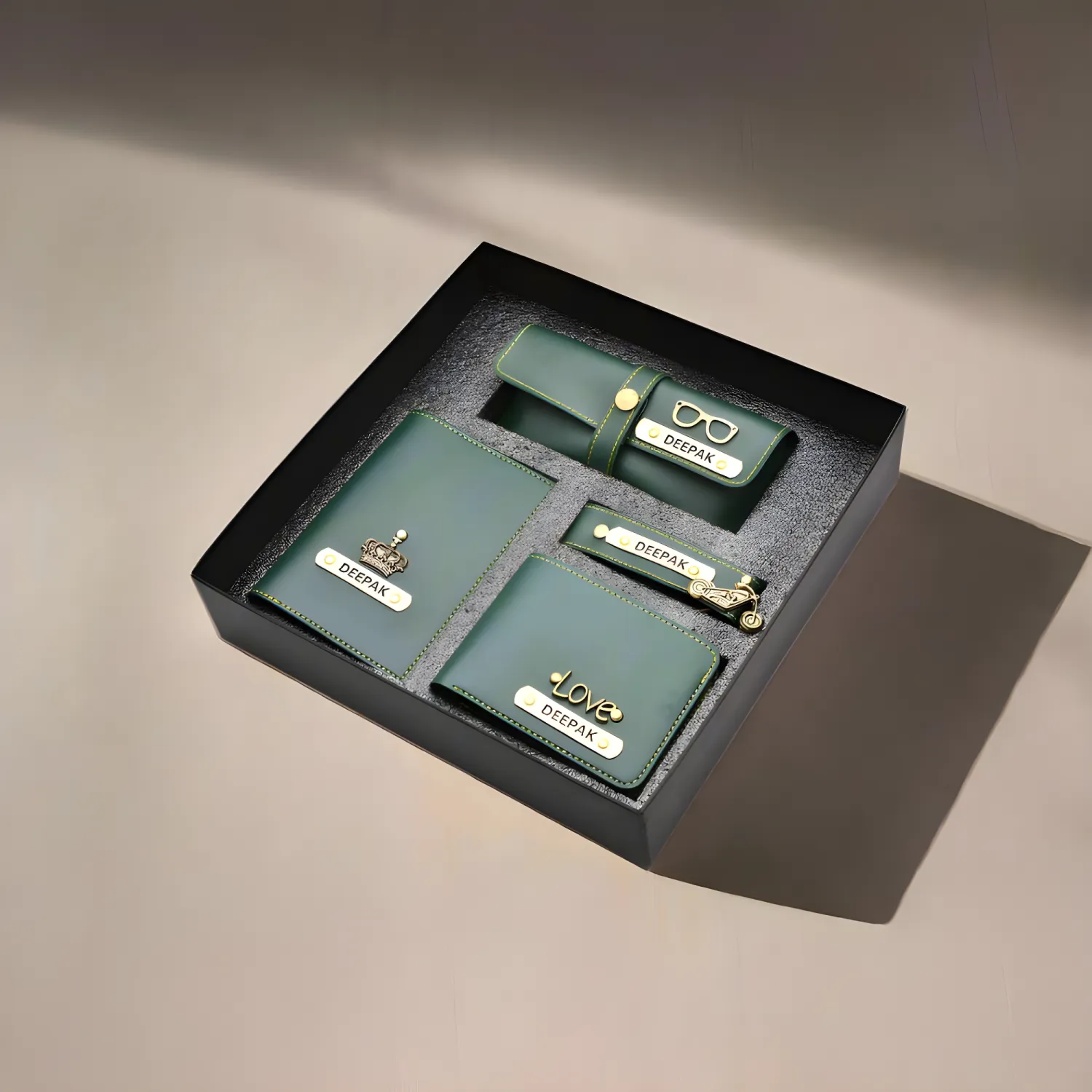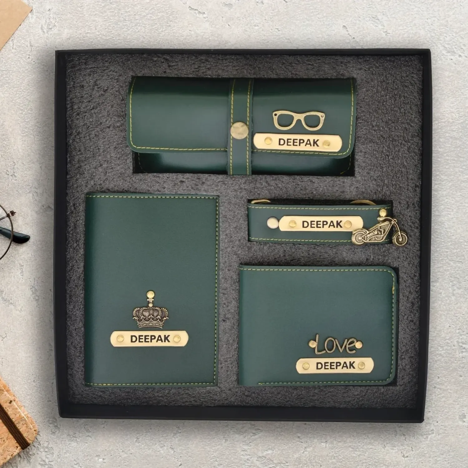 Make every gift memorable with this thoughtfully designed personalized men’s travel combo. Crafted from high quality vegan leather, the set includes four practical essentials that combine style, durability and everyday functionality. Each item can be customized with a name and charm using permanent engraving that does not rust or fade over time. The coordinated design and premium finish make the set ideal for travel and daily use while maintaining a refined look. Packed in an elegant gift box, it is perfect for birthdays, special occasions or thoughtful surprises. This personalized combo offers a unique way to show appreciation while gifting something both stylish and useful.