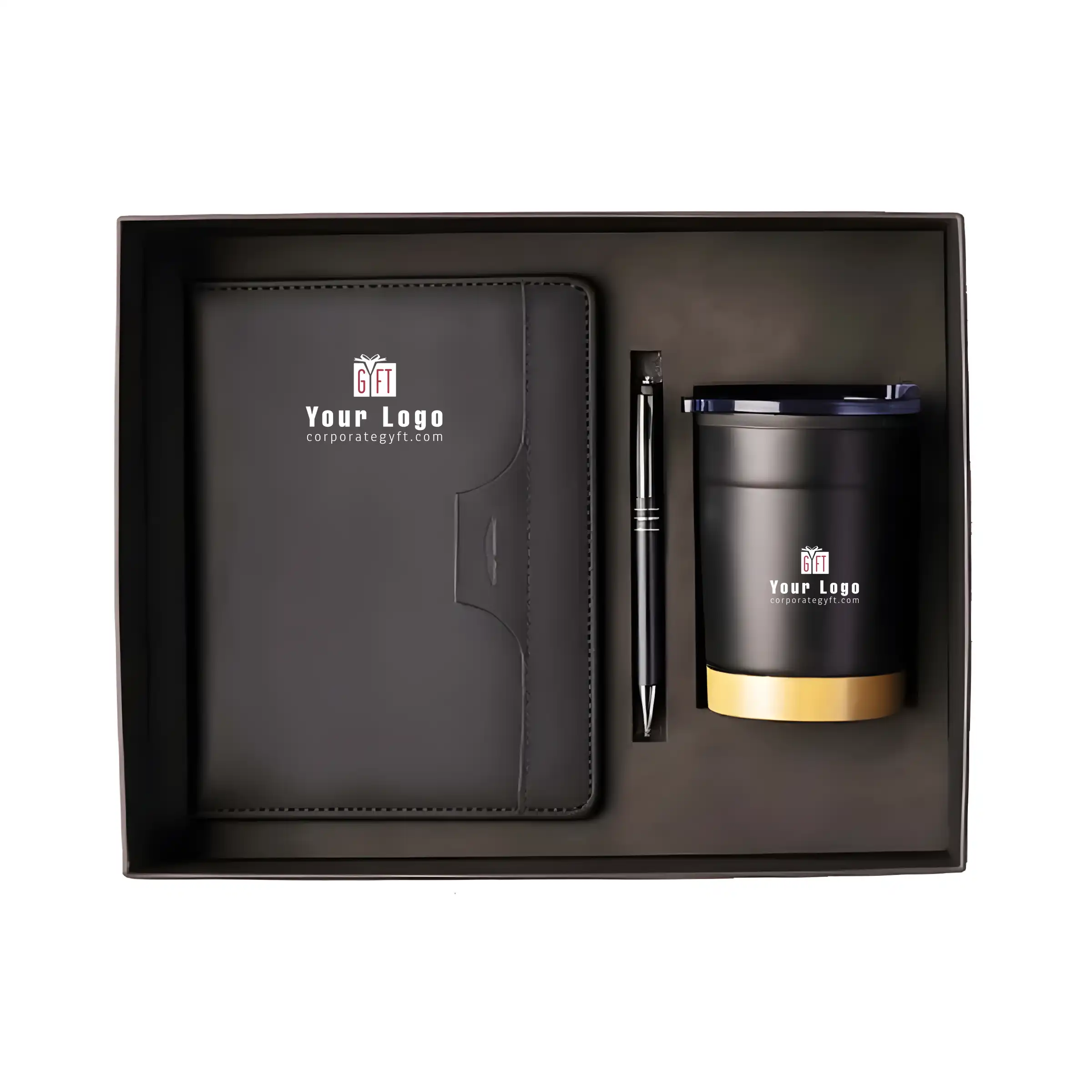 The premium 3-in-1 gift set is thoughtfully curated with an black leatherette notebook, a matching sleek executive pen and a stylish travel mug featuring a natural bamboo base for an elegant touch. The smooth-textured notebook offers a refined writing experience, making it perfect for daily notes, meetings, and journaling. Executive pen complements the set with a professional look and comfortable grip for effortless writing. The travel mug ensures convenient sipping on the go while adding a modern, eco-inspired appeal. The entire set is neatly arranged in a premium cardboard gift box for impressive presentation and safe handling. Custom logo and design printing space make this set ideal for impactful brand promotion and memorable corporate gifting.