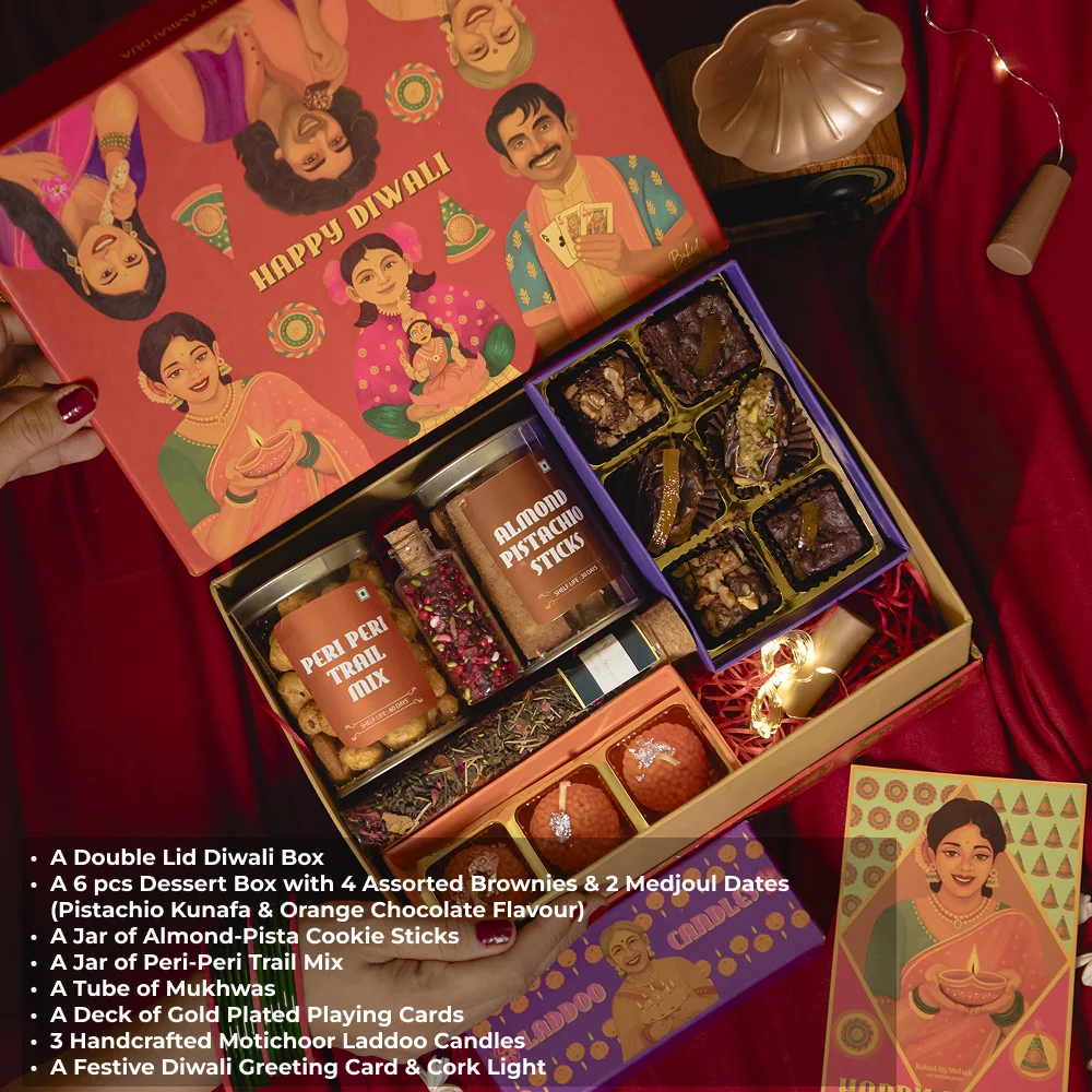 This Diwali gift hamper is thoughtfully curated blend of festive treats and premium keepsakes, perfect for celebrating the festival of lights. It features a double-lid Diwali box, a 6-piece dessert box with assorted brownies and Medjoul dates, a jar of almond-pista cookie sticks, a jar of peri-peri trail mix, a tube of mukhwas, a deck of gold-plated playing cards, 3 handcrafted motichoor laddoo candles, and a festive greeting card with a cork light. The hamper comes in a retro-Bollywood-inspired keepsake box, elegantly packaged for a luxurious gifting experience. With space for custom logo or design printing, it is an ideal gift for colleagues, corporate clients, employees, or loved ones, combining indulgence, style, and festive charm.