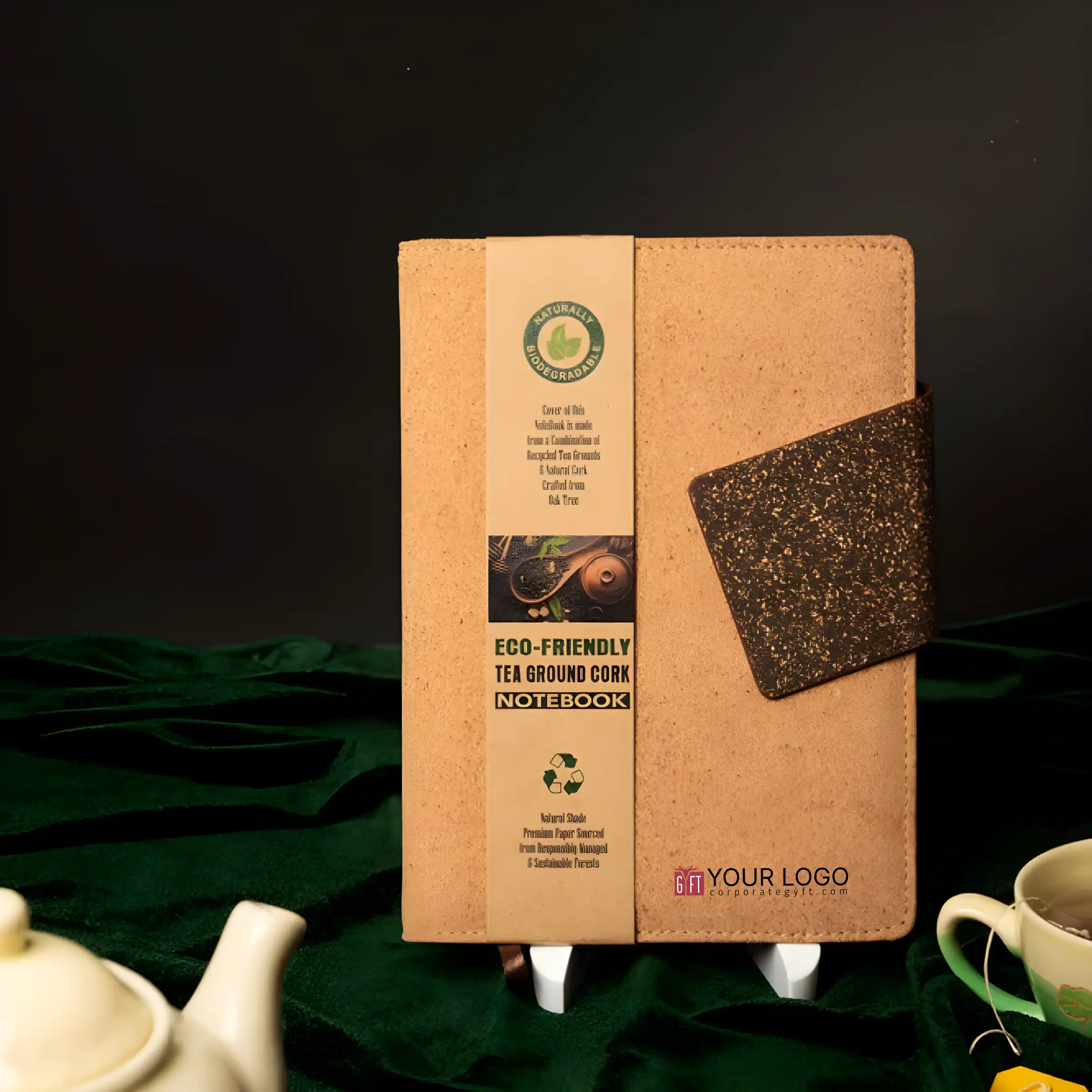 Celebrate sustainability with an elegant notebook and pen gift set designed for everyday use and thoughtful eco-friendly gifting. The notebook features an elastic band closure and a unique tea-ground cork cover that adds natural texture and durability. Paired with a smooth-writing pen featuring a comfortable grip and metal tip, the set ensures a pleasant writing experience. Packed in a sturdy kraft-style rigid gift box, it delivers a clean and earthy presentation perfect for sustainable corporate gifting, eco hampers, onboarding kits, students and business events. Custom branding options allow every gift to reflect your brand’s commitment to quality and the environment.