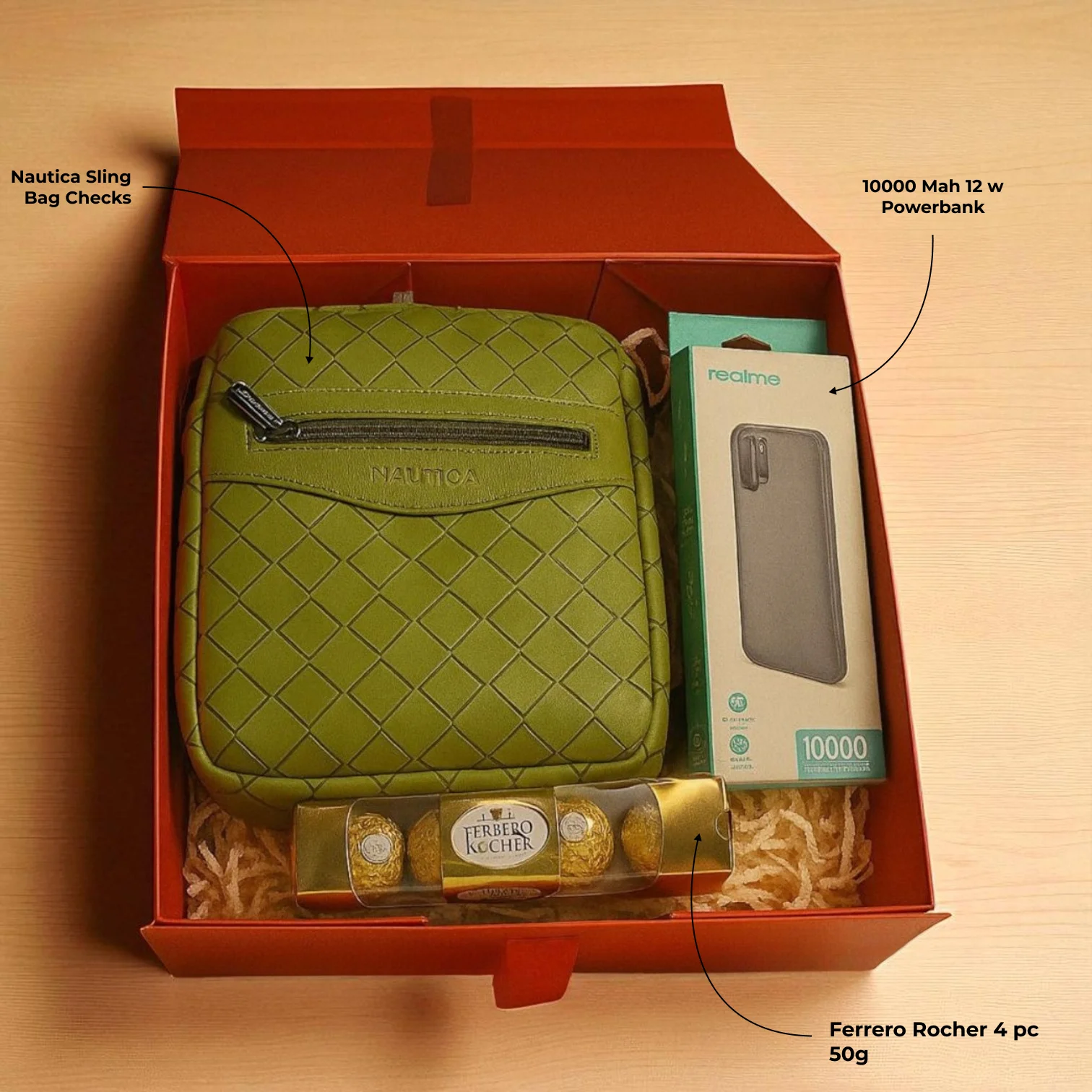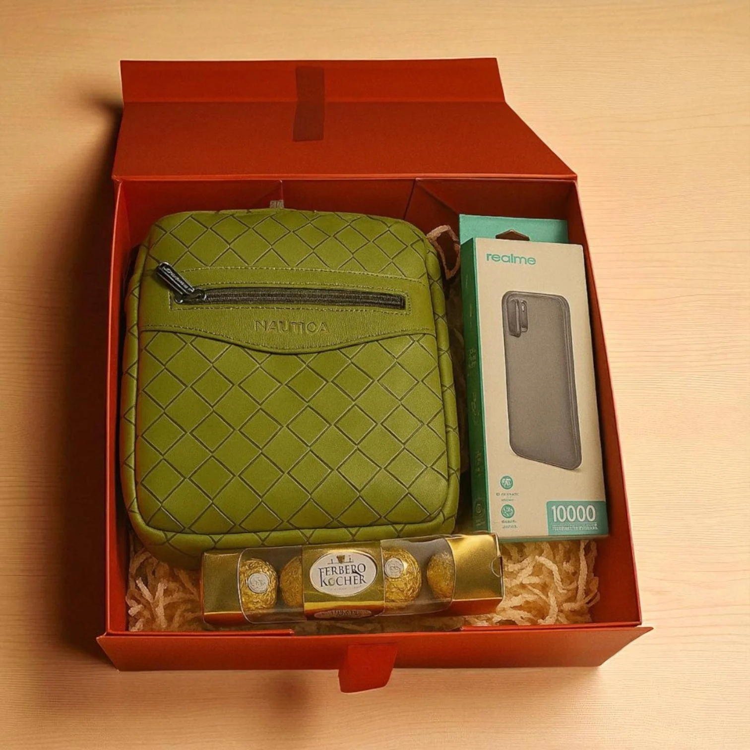 This curated gift hamper features a stylish green Nautica sling bag made from high-quality PU with a secure zipper closure. It also includes a powerful 10,000 mAh power bank with 12W output for on-the-go charging. Complementing the set are four pieces of delicious Ferrero Rocher chocolates. Beautifully packaged for a premium unboxing experience, this hamper is ideal for festive gifting, corporate giveaways, and special occasions.