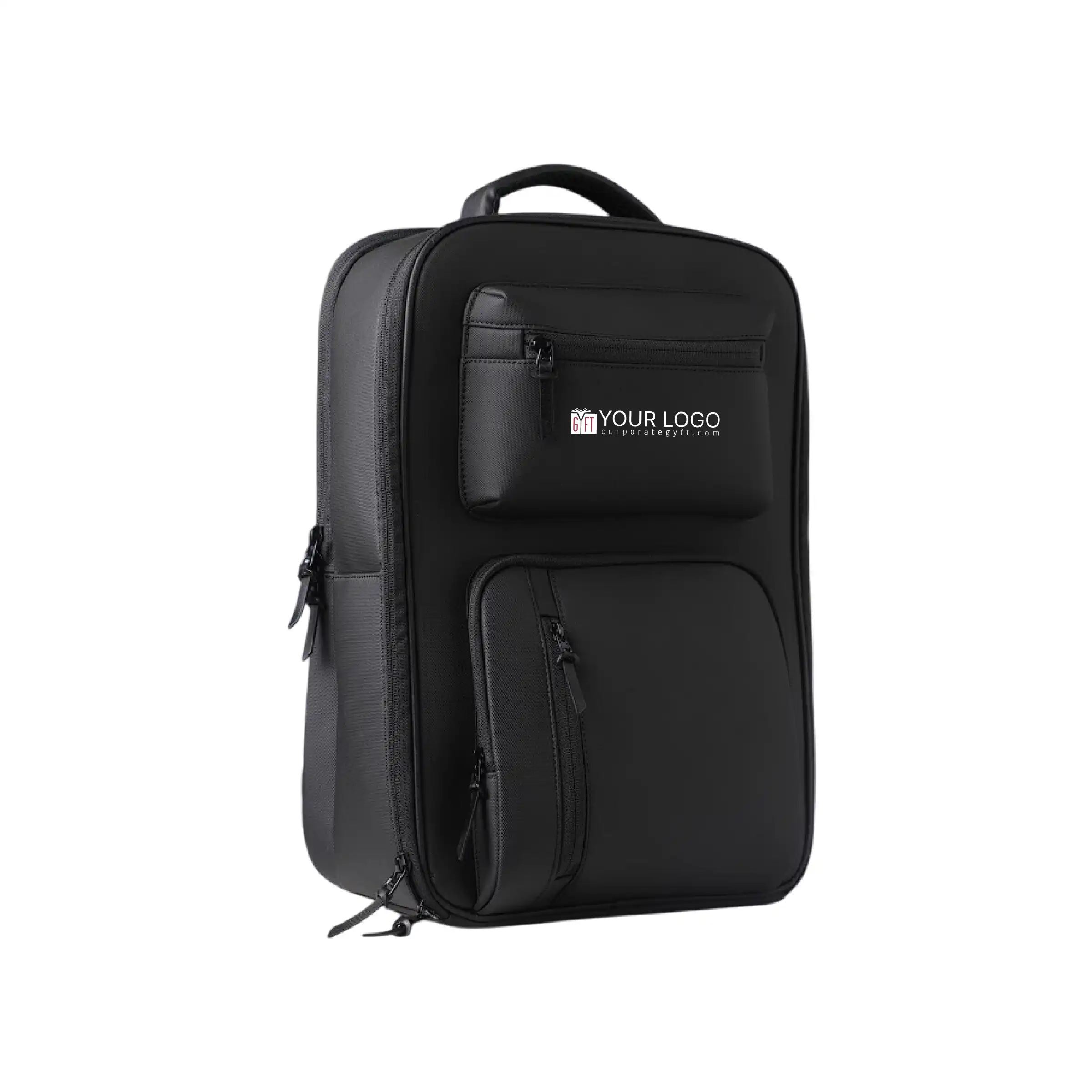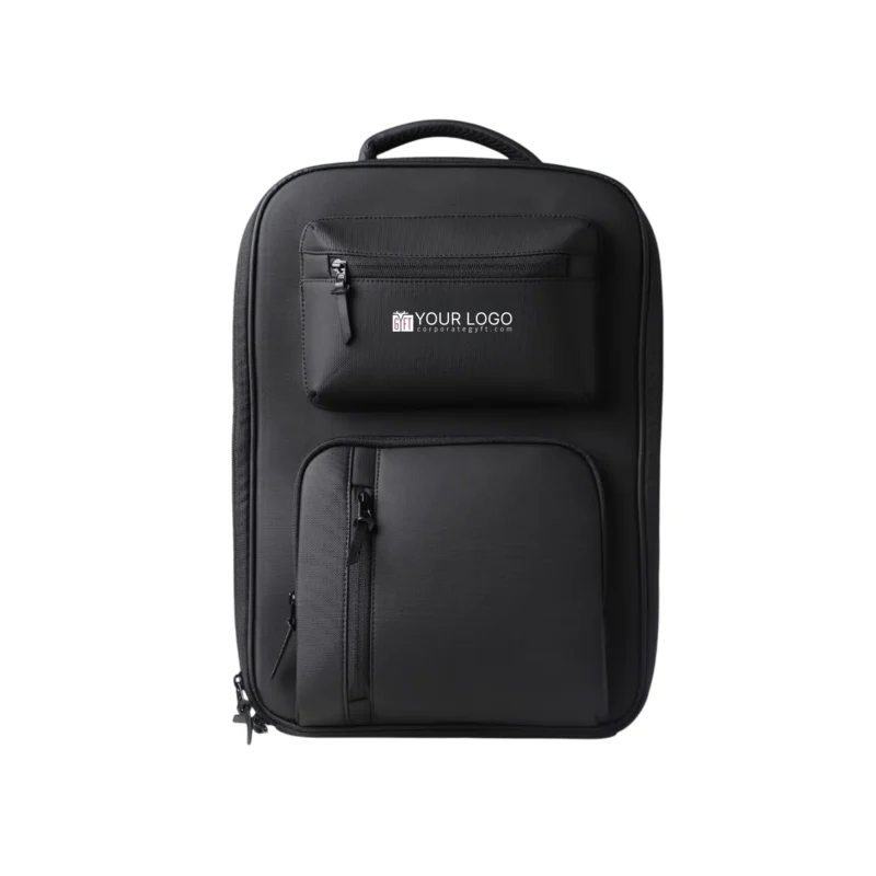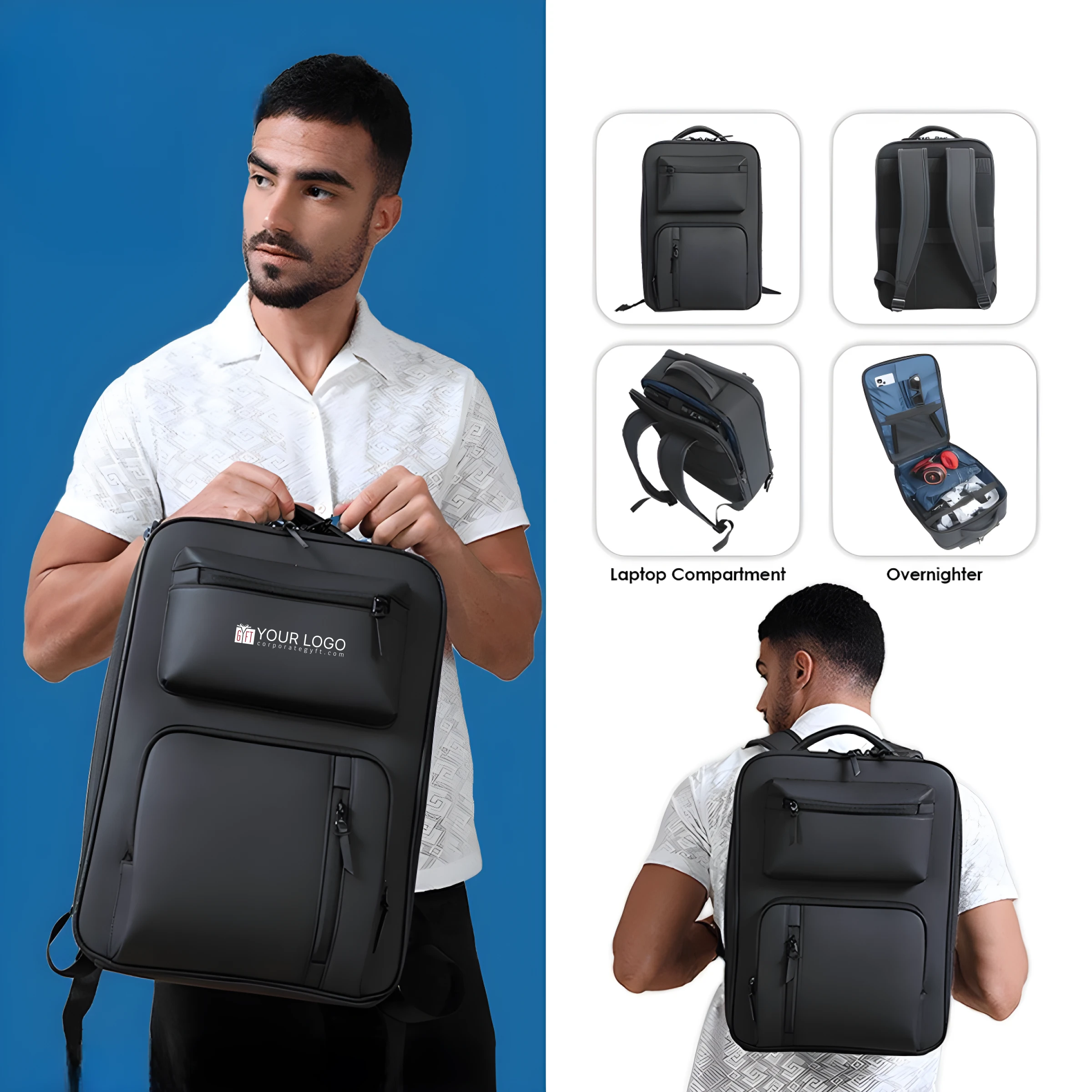 Laptop backpack designed in a practical 43×30×18.5 cm size using fused polyester fabric, built to deliver durability with premium waterproof protection for everyday and travel needs, featuring an overnighter-friendly layout with a large opening main compartment for easy packing, an internal strap to hold articles in place securely, a padded 16-inch laptop compartment to safeguard devices, multiple quick access pockets for organized storage of essentials, and a luggage trolley holder for effortless movement during travel, complemented by space available for custom logo and design printing, making it suitable for business travel, overnight stays, office commuting, corporate use, and premium gifting.