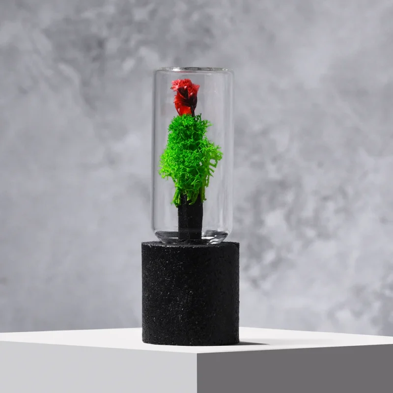 - Materials: Glass vessel, preserved moss, dried flowers, magnetic cork base