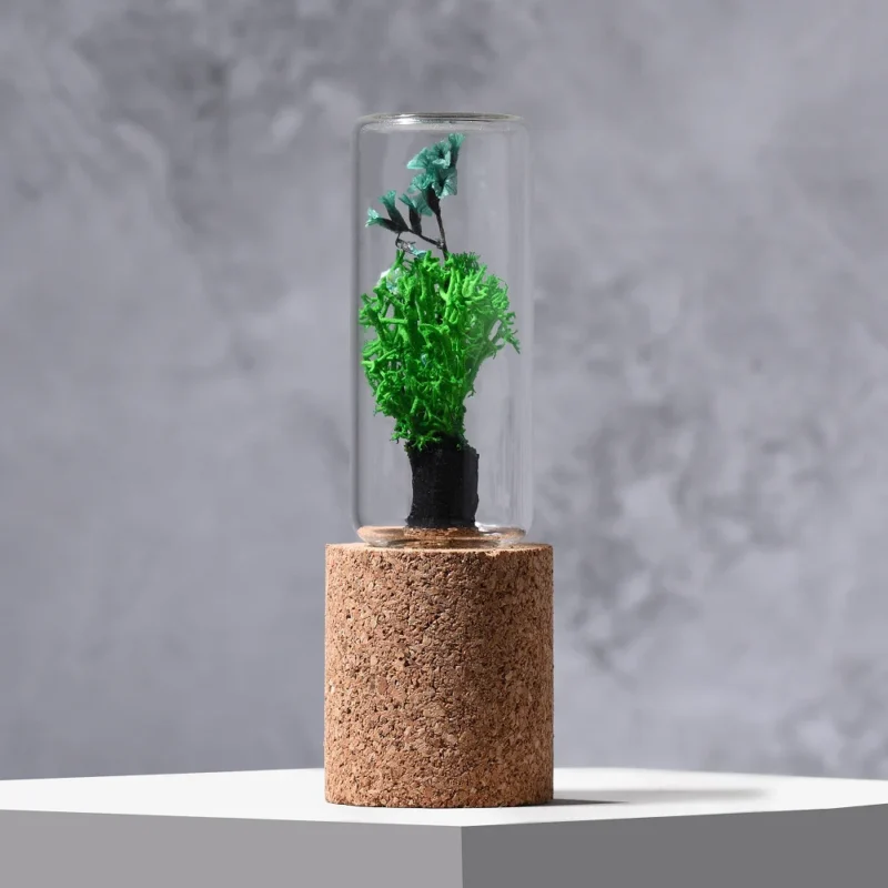 - Materials: Glass vessel, preserved moss, dried flowers, magnetic cork base