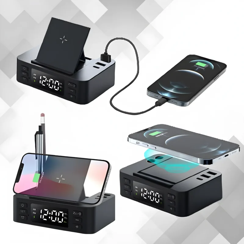 Designed to enhance productivity and workspace organization, the 7-in-1 desktop gadget combines multiple everyday essentials into one compact and modern unit sized at 12.2×8.6×3.8 cm. Featuring a digital clock with dual alarms and 12/24H time mode, it ensures accurate time management for office desks and work-from-home setups, while the adjustable 3-level brightness offers comfortable visibility in different lighting conditions. The integrated pen holder keeps stationery neatly organized, and the foldable mobile stand provides convenient hands-free viewing during calls or work sessions. Equipped with 15W wireless charging along with dual USB and one Type-C output, the gadget allows efficient multi-device charging from a single hub, reducing desk clutter. With space available for custom logo and design printing, it also serves as a premium branding solution, making it an ideal choice for office desks, work-from-home setups, and corporate gifting.