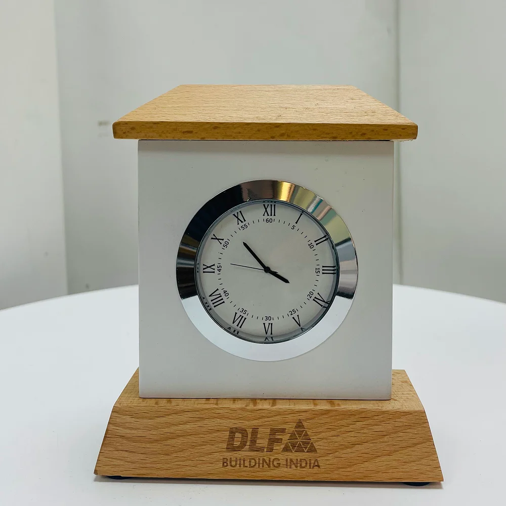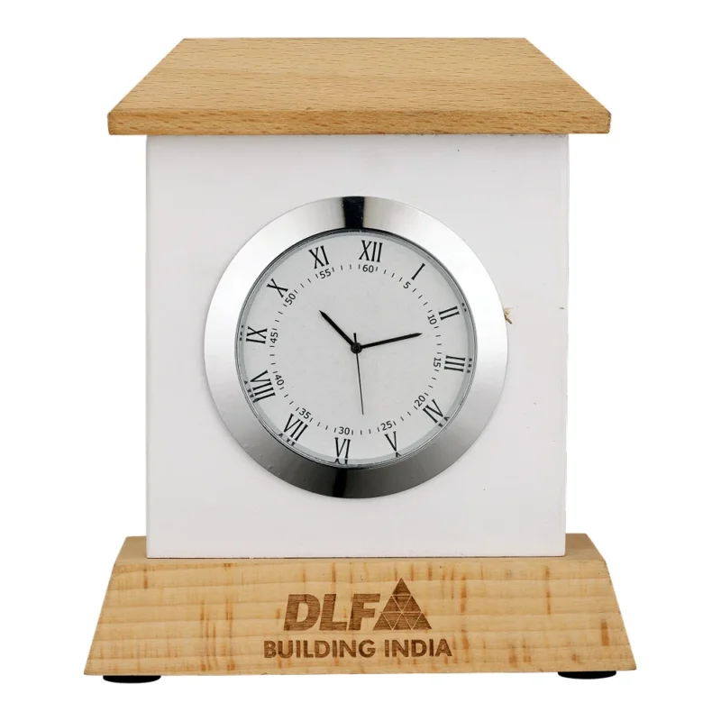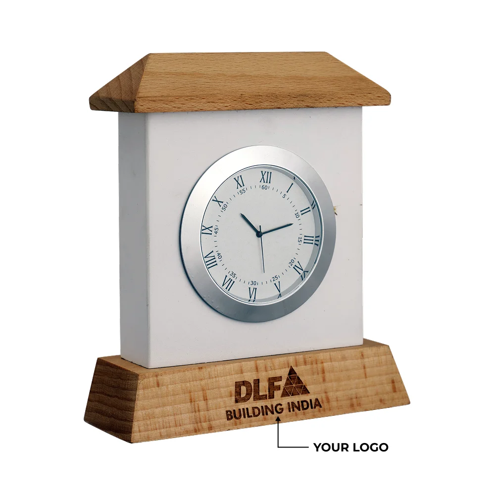 Refined table clock designed in a 4.35″ × 5″ frame, blending a clean white body with a sturdy wooden base for a premium look. An analog dial with roman numerals adds a classic touch, ensuring clear readability and timeless appeal. The durable 265 g build keeps it stable on office desks and home workstations. Battery-operated mechanism offers reliable performance with minimal maintenance. The wooden base features a 0.75″ × 2.25″ engraving area, ideal for custom logo placement and branding promotions. Perfect choice for corporate gifting, premium giveaways and enhancing workspace aesthetics. Elegant styling makes it a versatile décor piece for both professional and home environments.