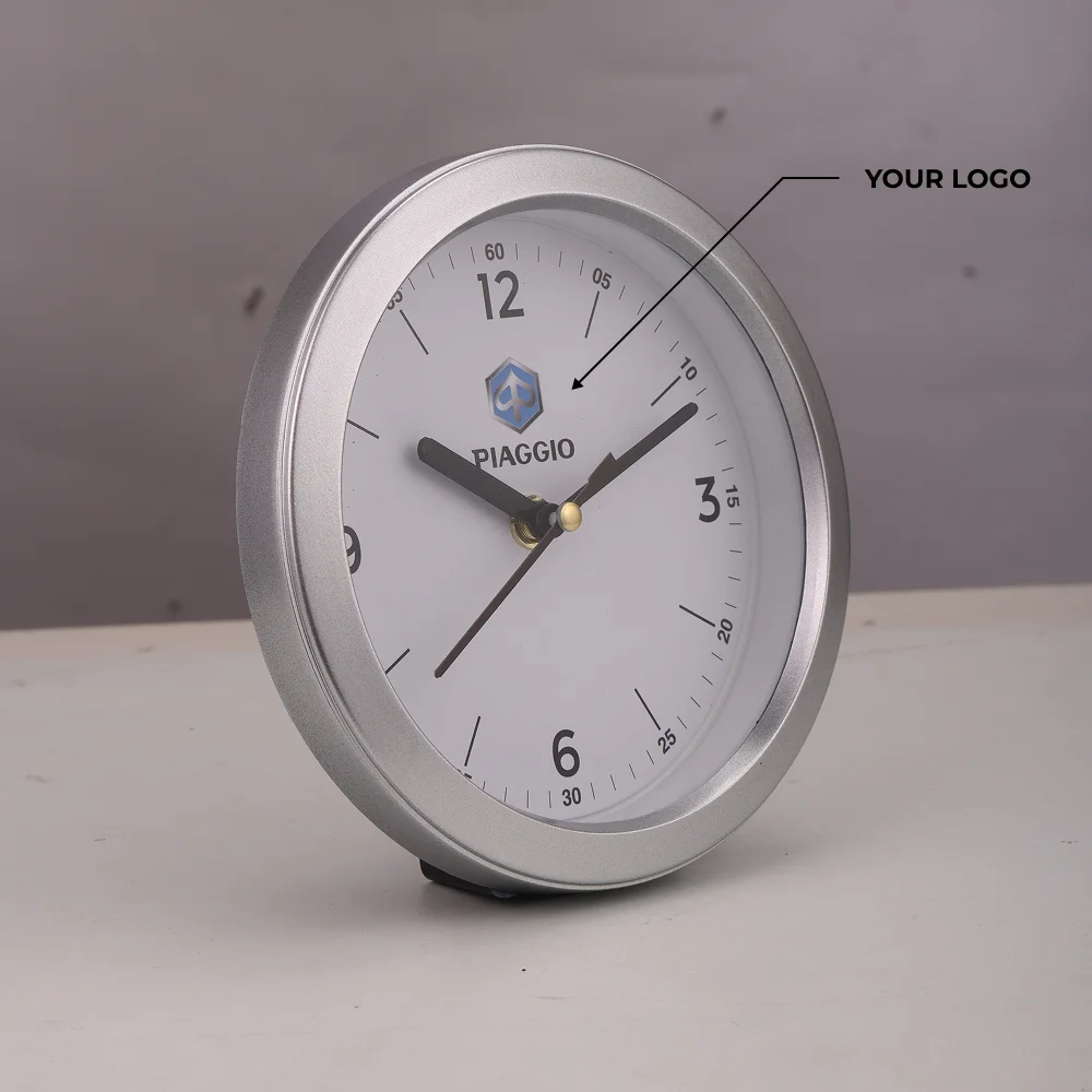 Crafted in a 6-inch circular design, the analog table clock features a clear 5.5-inch dial for easy visibility from any angle. Smooth-touch construction paired with a durable build makes it suitable for everyday use across study tables, office cabins, and home workspaces. A loud alarm rings for up to 30 minutes, offering reliable wake-up support for students and professionals. Lightweight yet sturdy with a 240 gms gross weight and 180 gms net weight, the clock balances portability with strength. Powered by a single AA battery, it ensures hassle-free, consistent performance. Space is available for custom logo printing, making it ideal for bulk branding, festive hampers, and promotional gifting. A practical addition to any desk setup with both function and style.