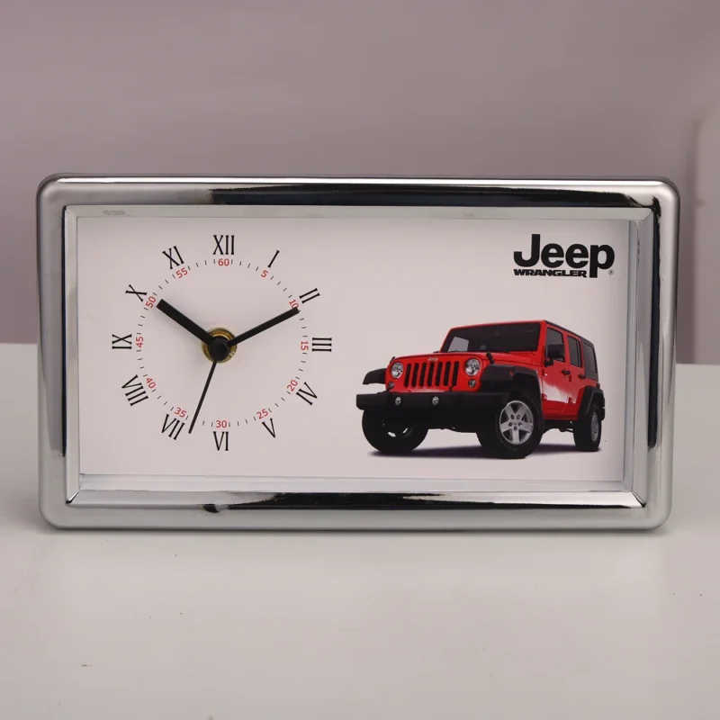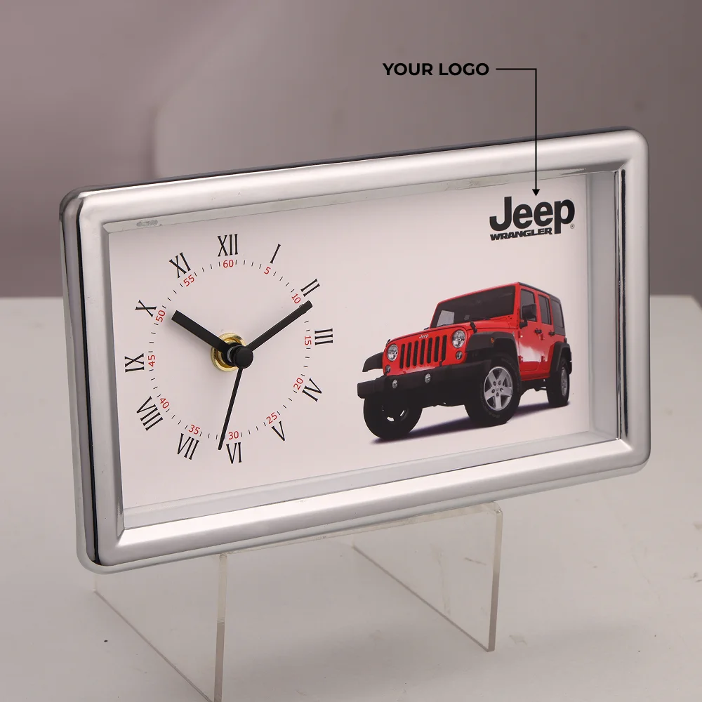 Elegant 4.5×8-inch rectangular table clock designed with a 3.5×7-inch dial for wide, clear visibility. The analog display adds a classic touch, making it suitable for professional desks, reception counters, and home study areas. Lightweight construction with a 275 g gross weight and 215 g net weight allows easy placement on any surface. Powered by a single AA battery, the clock ensures dependable performance throughout the day. The sleek frame enhances décor while maintaining functional simplicity. Branding space on the front panel enables custom logo printing, making it ideal for corporate gifts and promotional campaigns. A refined timepiece that blends practicality with modern presentation.