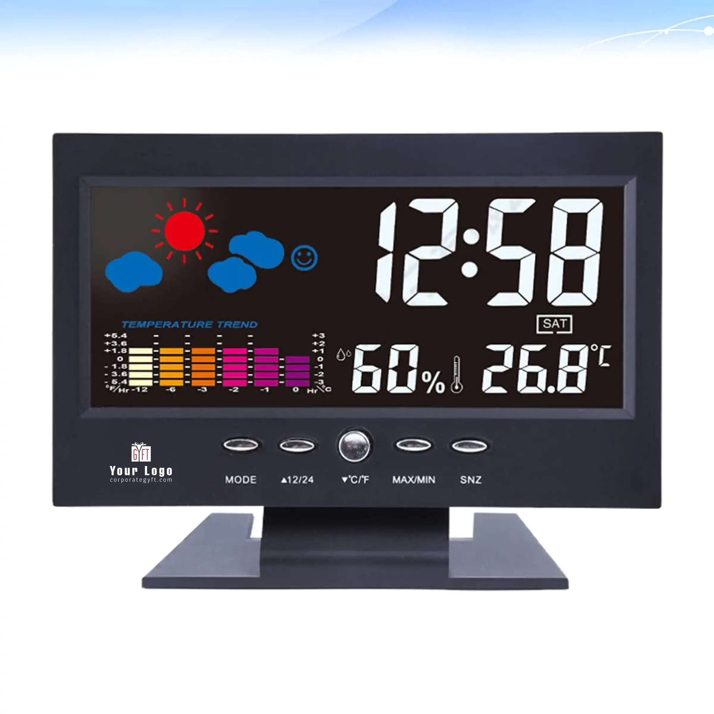 This smart weather and time display clock brings clarity, convenience and style to any room. Its vibrant multi-color screen shows temperature, humidity, date and time at a glance, while the voice-control feature and backlight ensure effortless use day or night. The alarm with snooze keeps your routine on track, and the perpetual calendar adds everyday utility. Compact yet full of functionality, it fits perfectly on home desks, office tables or bedside corners. A sleek digital essential that also makes a thoughtful, brand-ready gifting option.