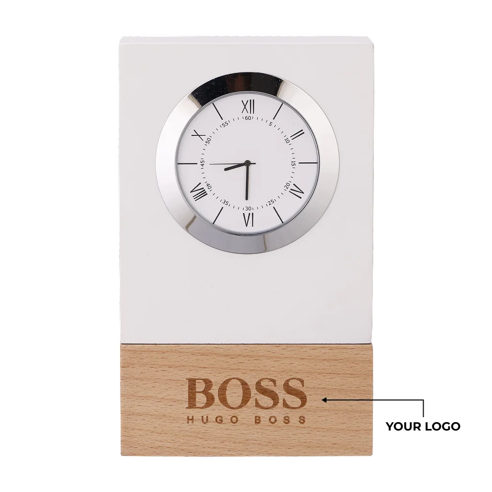 Elegant table clock crafted in a 3.5″ × 5.75″ frame, designed to bring a refined touch to workspaces and premium setups. The analog display offers classic readability, making it suitable for both professional and home environments. A solid 320 g build ensures durability while maintaining a sleek, modern appearance. The smooth surface provides a dedicated 1″ × 1.5″ branding area for precise custom logo printing. Ideal for corporate gifting and premium branding initiatives due to its stylish look and practical utility. The compact design fits seamlessly on desks, shelves, and reception counters, enhancing overall décor. Perfect blend of aesthetics and functionality for high-value gifting.