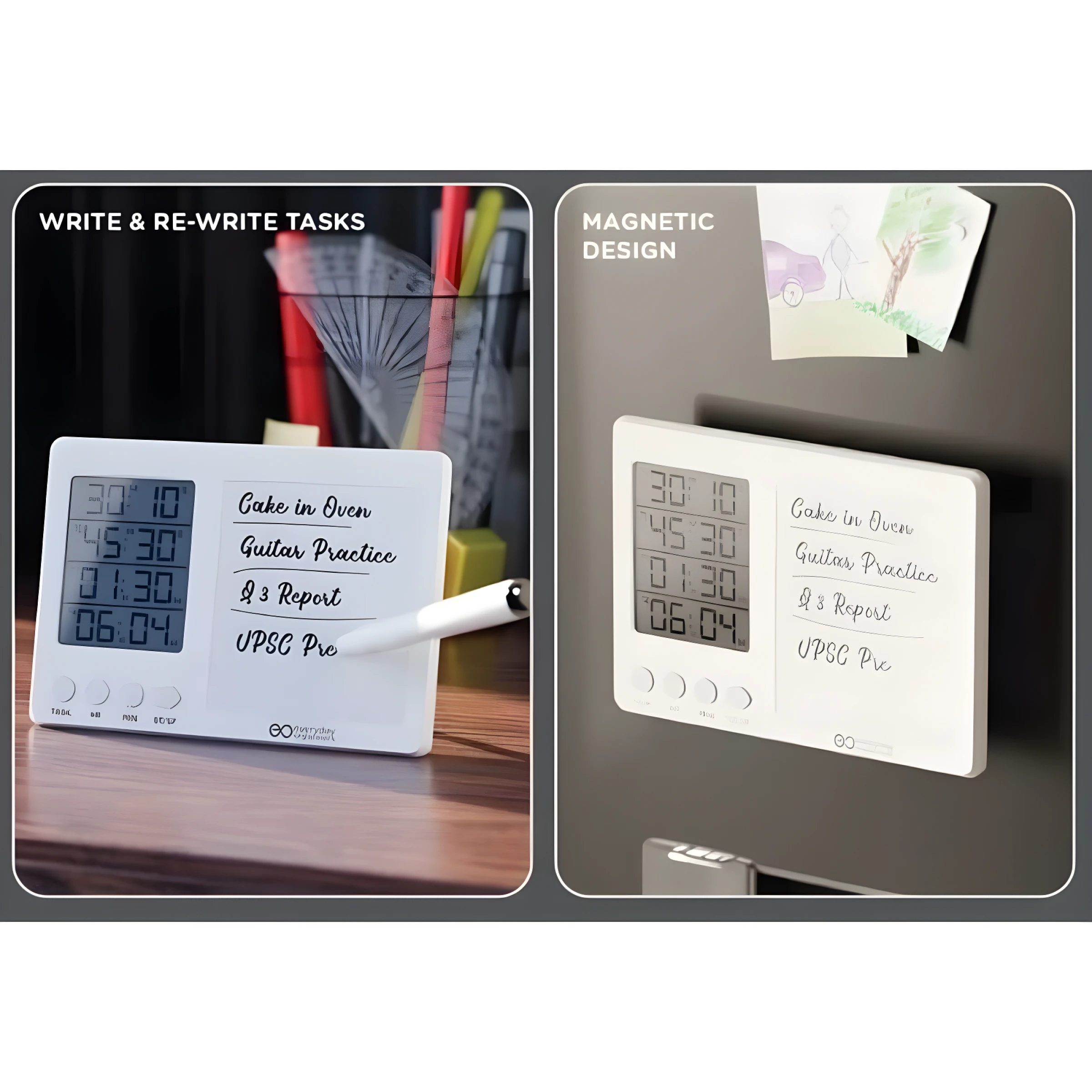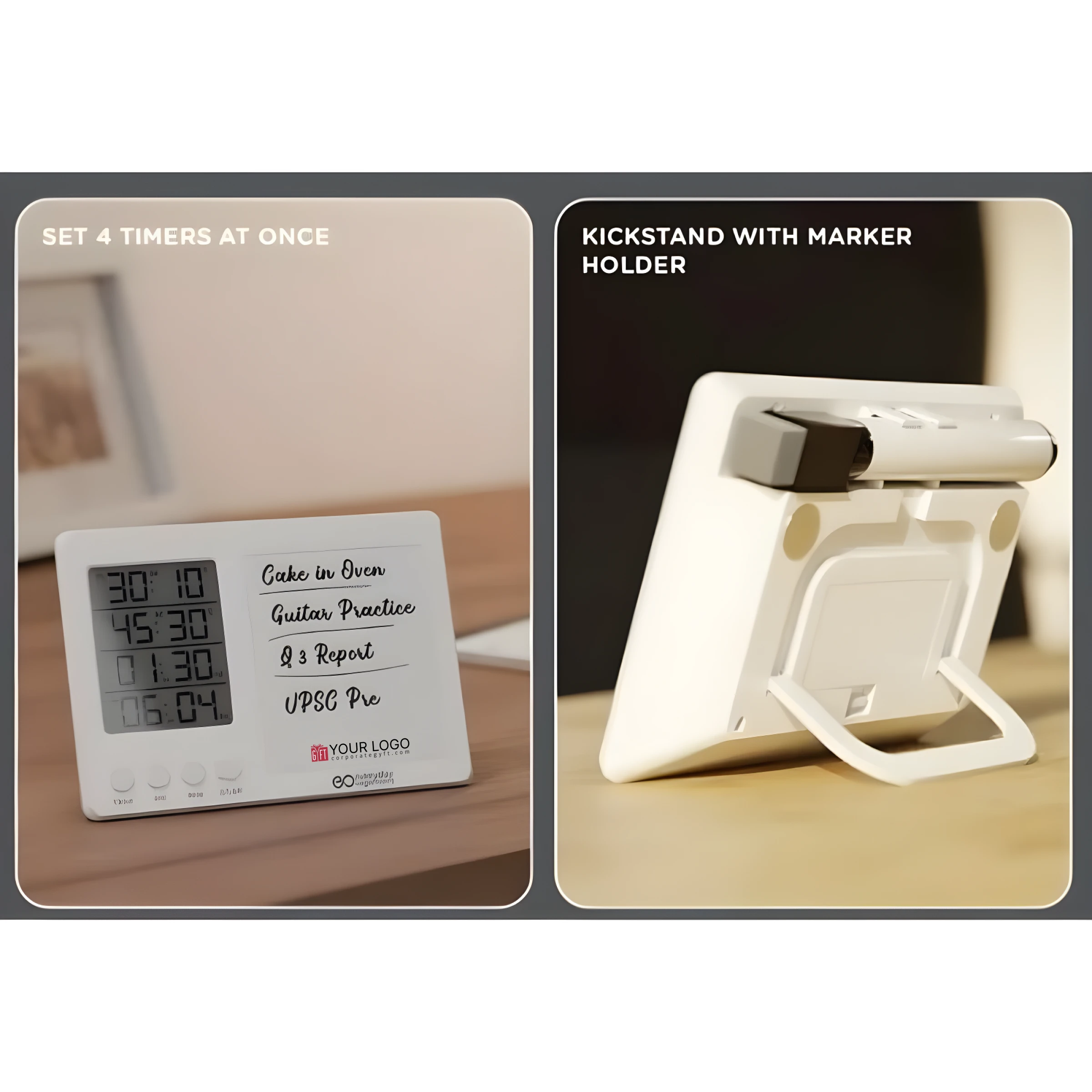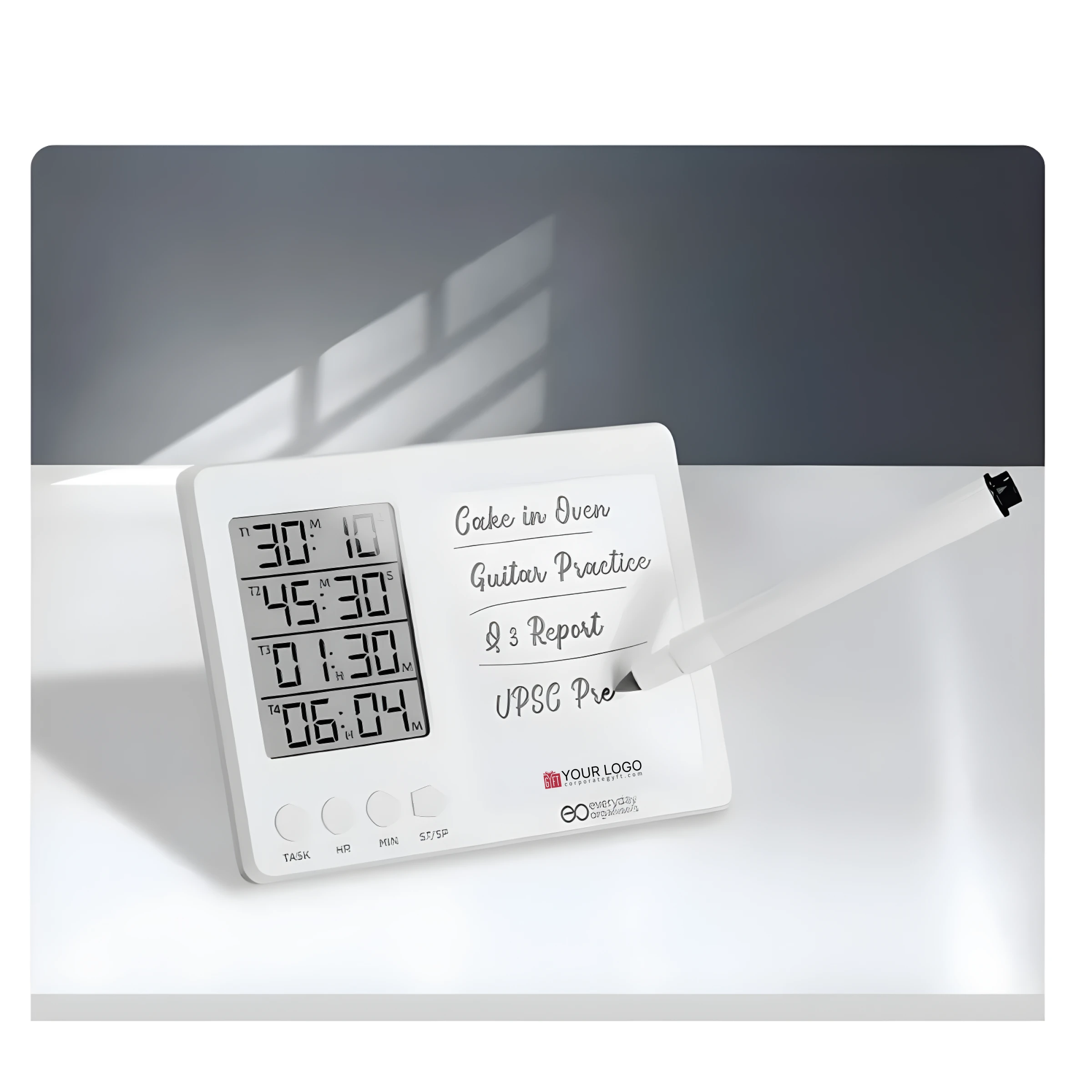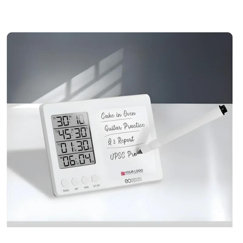 Digital time board designed to simplify daily planning and time management by combining a stopwatch, LCD and the ability to set 4 timers at once with a smooth erasable whiteboard that allows users to write and re-write tasks effortlessly, making it ideal for structured routines, focused study sessions, and multitasking environments, supported by a sturdy kickstand with an integrated marker holder for convenient desk use, while the magnetic back enables easy mounting on metal surfaces such as refrigerators or boards, enhanced with space available for custom logo and design printing to suit corporate or promotional needs, perfectly suited for students, professionals, home tasks, exam preparation and productivity tracking in both personal and workspaces.