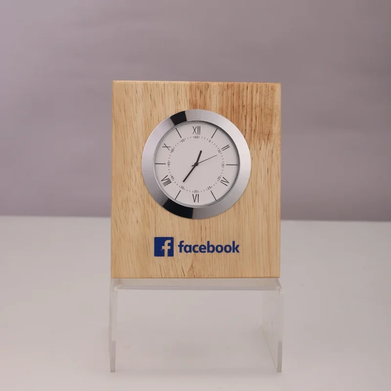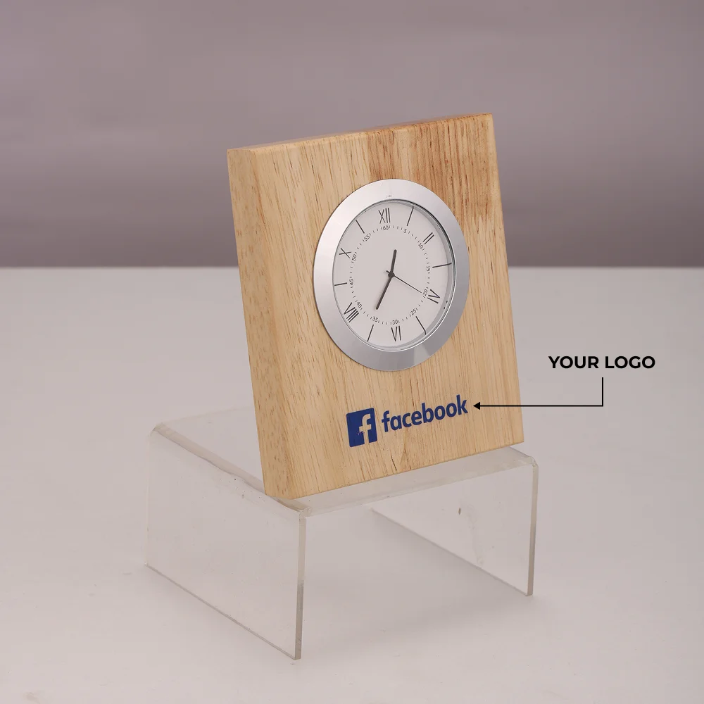 Modern wooden case analog table clock crafted for office desks, study rooms, and home décor offers a natural and classy look with its high-quality material and polished finish. The compact 4.5″ × 4.5″ size and 0.75″ × 2.5″ printing area make it ideal for custom logo branding. The integrated analog clock ensures convenient timekeeping, while its sturdy construction supports long-lasting use. A smooth, refined surface enhances the aesthetic appeal of any workspace or tabletop. Powered by a single AA battery, it provides reliable daily performance. Suitable for home offices, workspaces, hostels, and thoughtful gifting for colleagues or friends, making it a practical and stylish addition to any setting.