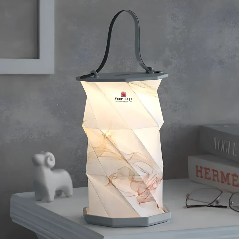 Stylish foldable lamp crafted to enhance modern interiors with a blend of elegance and practicality, featuring a compact form that measures 12×12×20 cm when open and neatly folds down to 12×12×2 cm for easy storage and portability. Powered by a rechargeable 1200 mAh battery, it offers cordless convenience for flexible placement across rooms. The magnetic closure and premium leatherette handle add a refined design touch, while the feather-touch button and long-press brightness adjustment allow smooth and intuitive lighting control. Designed to deliver soft ambient illumination, it works beautifully as a décor accent as well as a functional bedside light. With space available for custom logo and design printing, it makes an excellent choice for home décor, ambient lighting, bedside use, and premium corporate gifting.