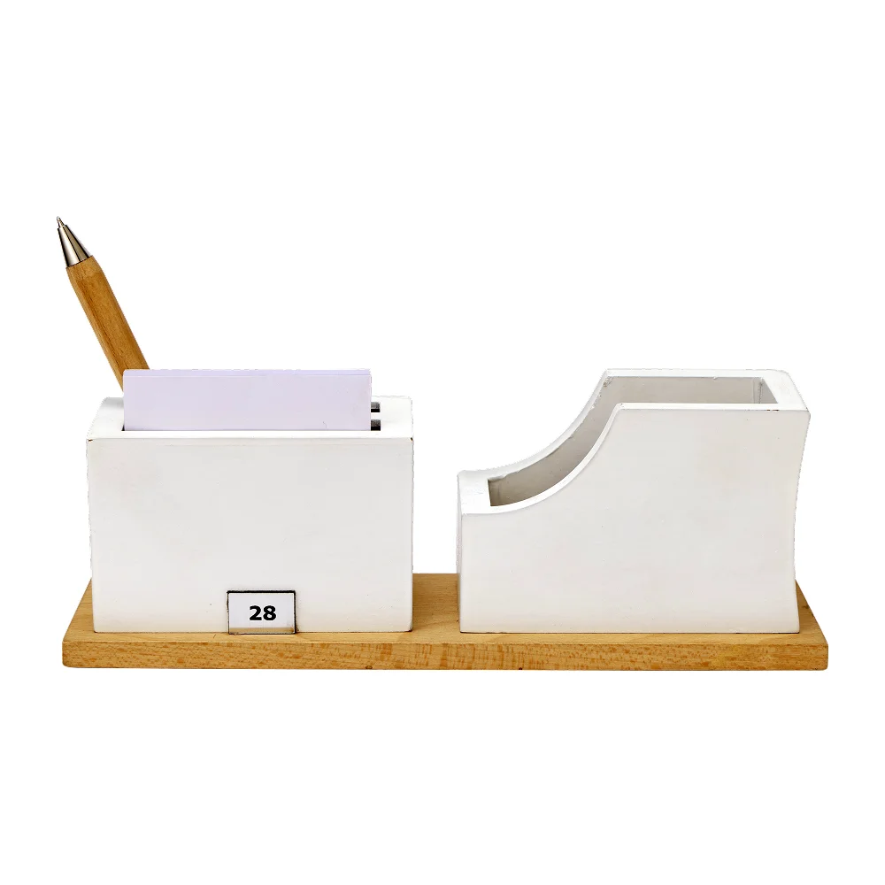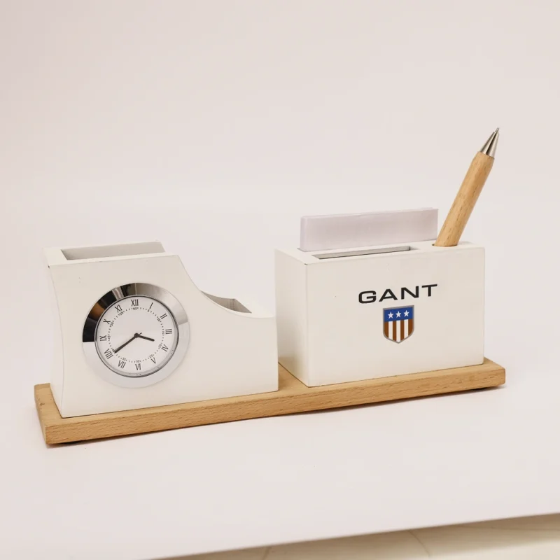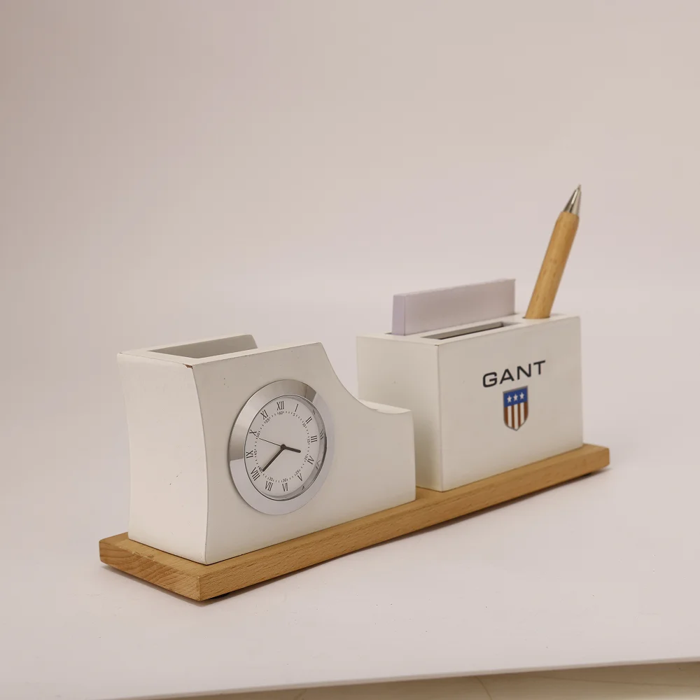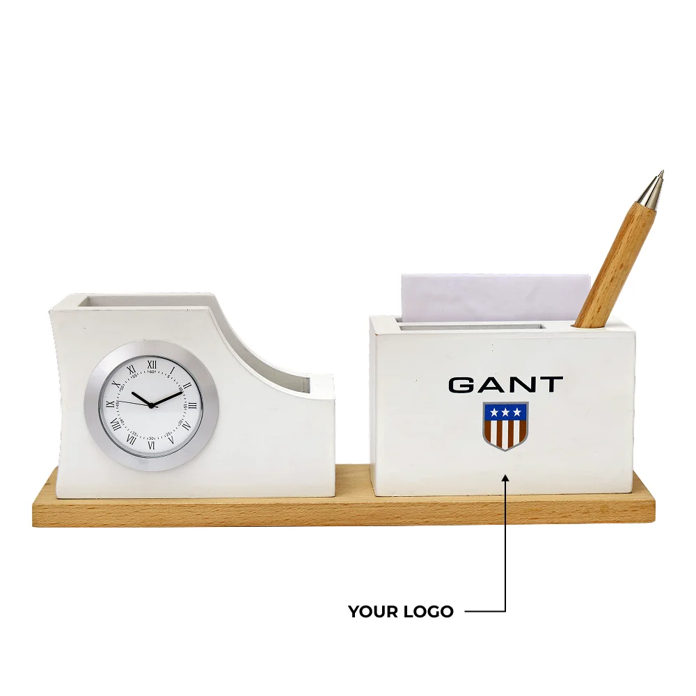 Designed to elevate workspace organization, the desk clock with pen stand and card holder brings together functionality and modern appeal. Sleek 2.75″ × 9.25″ layout provides a clear analog clock along with compartments for pens, stationery, and business cards. Smooth finish and sturdy wooden base offer stability while enhancing the aesthetic of office desks. Durable construction supports everyday use in professional environments. Compact design ensures clutter-free arrangement while keeping essentials within easy reach. Custom branding area allows impactful logo placement, making it ideal for corporate gifting and promotional use.