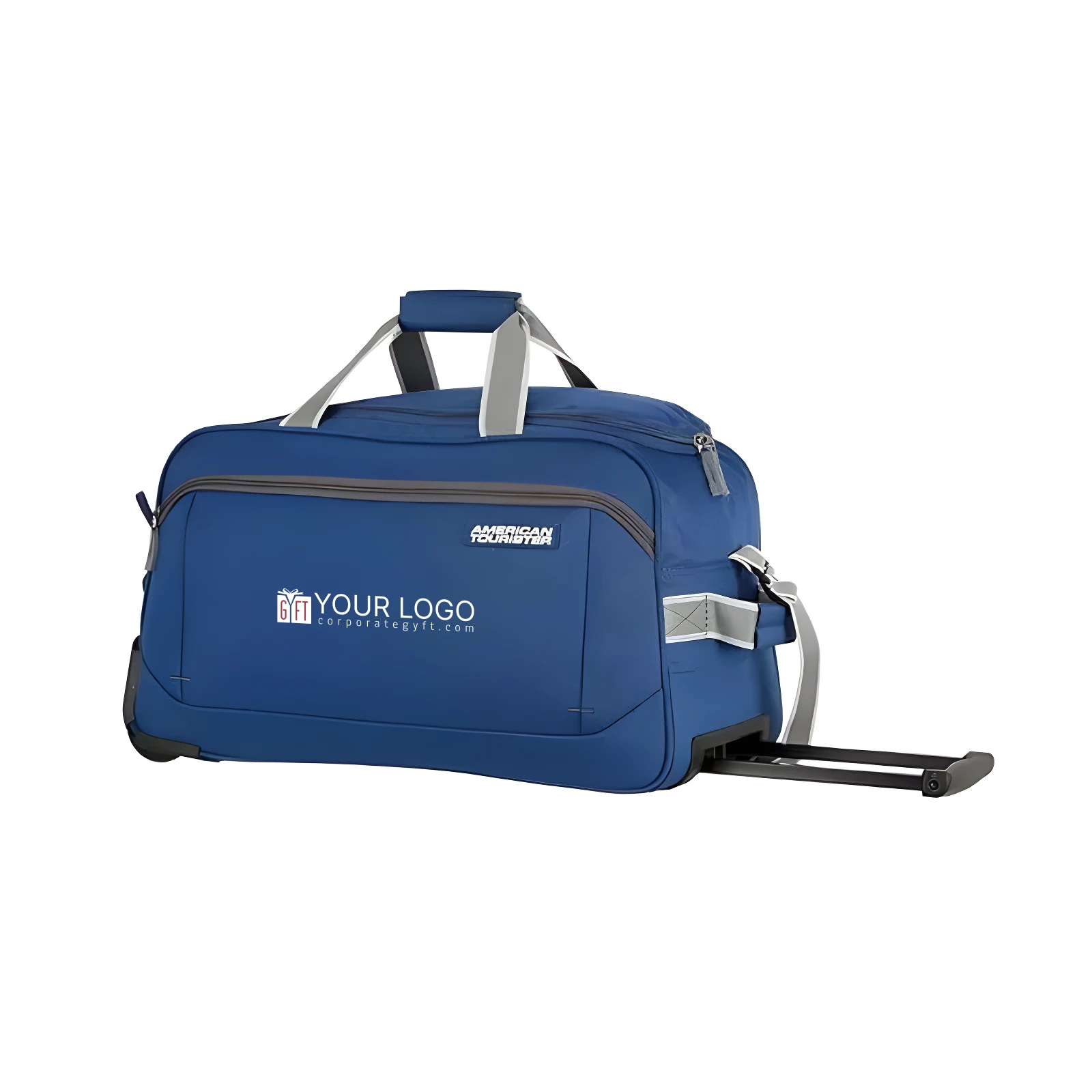 The American Tourister cabin-size duffle bag is a durable and versatile travel companion crafted from high-quality 600D polyester fabric. Measuring 57 x 30 x 32 cm, it offers ample space for packing essentials, featuring a spacious front pocket, a U-shaped main compartment with lockable pullers, twin grab handles with padded strap, and an adjustable shoulder strap with rest pad for comfortable carrying. Its practical design makes it ideal for both men and women, suitable for short trips, corporate travel, or daily use. The bag also provides space for custom branding, making it perfect for corporate retreats, employee gifting, giveaways, and offsite events. Combining functionality, style, and premium quality, this duffle bag is a reliable choice for all travel and gifting needs.