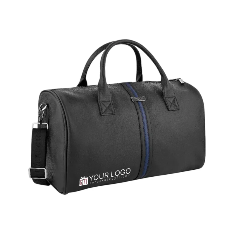 The black leather duffel bag combines style, functionality, and versatility for the modern traveler. Crafted from fine-grain leather, it features a spacious interior with multiple pockets to keep your essentials organized. The distinctive blue stripe adds a touch of sophistication, while the adjustable shoulder strap ensures comfortable carrying. Ideal for weekend getaways, gym sessions, or business trips, it also offers space for a custom logo for personalization. A timeless companion that elevates every travel experience.