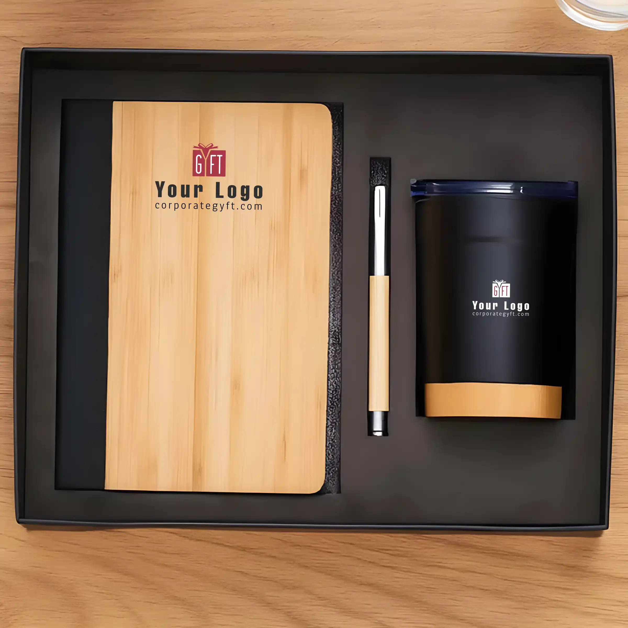 Eco-friendly 3-in-1 gift set thoughtfully designed for sustainable corporate and festive gifting. Notebook crafted with wood and bamboo finish offers a natural feel for daily notes and planning. The matching pen provides smooth writing performance with a stylish eco touch. Tumbler complements the set with practical everyday usability for office and home. Customizable with UV printing and logo branding to create a unique brand identity. Packed in a cardboard box with premium presentation, making it an ideal Diwali gift for employees, clients, and business associates.