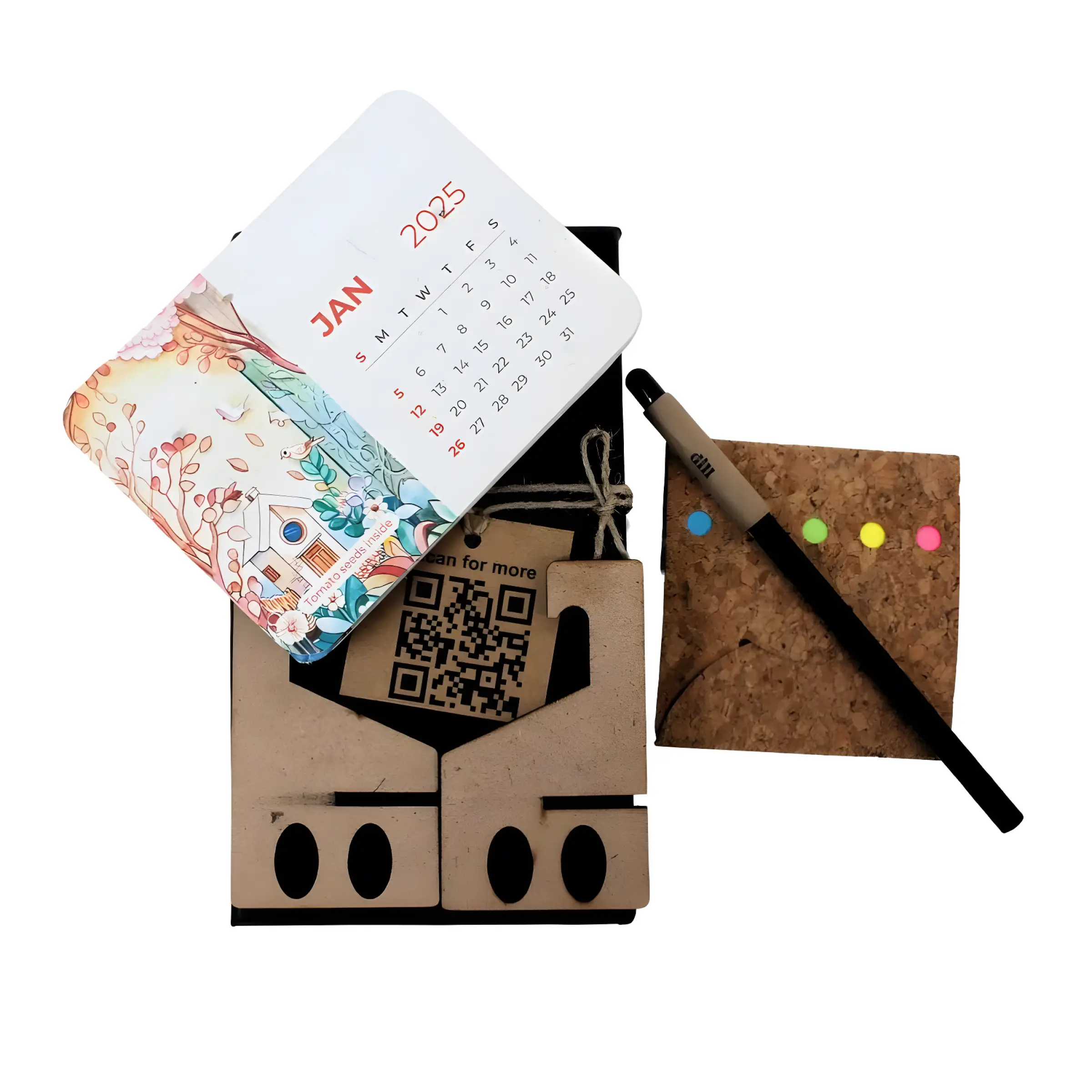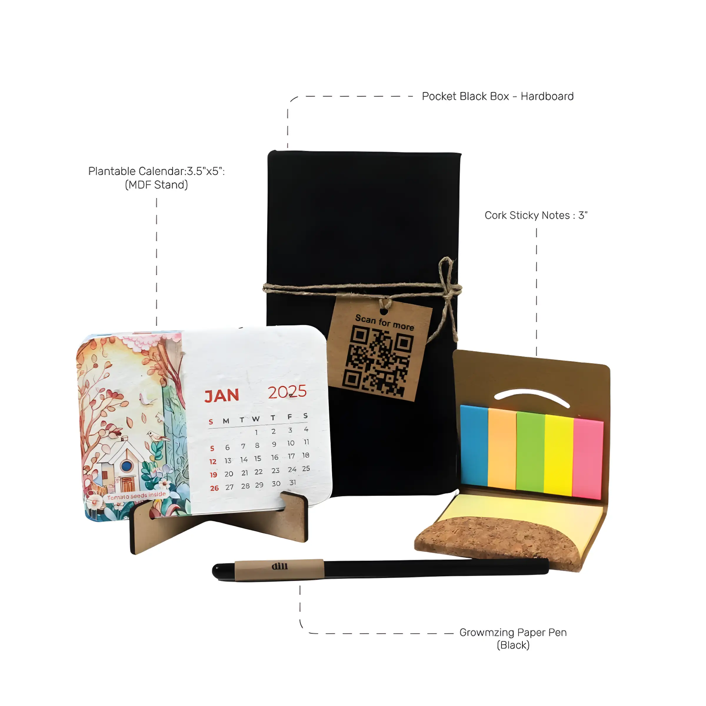 CK33-60—an eco-friendly premium stationery gift kit curated to combine functionality with responsible design, featuring a compact 3.5 × 5-inch plantable desk calendar paired with a sturdy MDF stand that adds a refined touch to any workspace. Complemented by 3-inch cork sticky notes and a black Growmazing paper pen, the kit supports everyday productivity while reinforcing an environmentally conscious mindset. Thoughtfully packed in a pocket-style black hardwood box, it offers a sleek and premium presentation suitable for professional settings. With dedicated space available for custom logo and design printing, the kit makes a meaningful choice for corporate gifting, festive occasions, conferences, executive giveaways, and sustainability-focused campaigns where elegance, utility, and brand value align seamlessly.