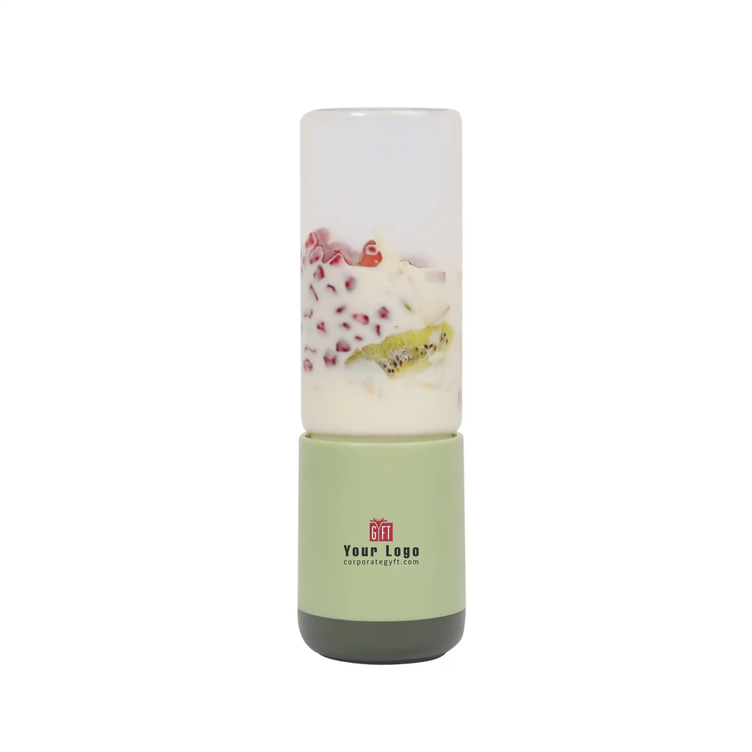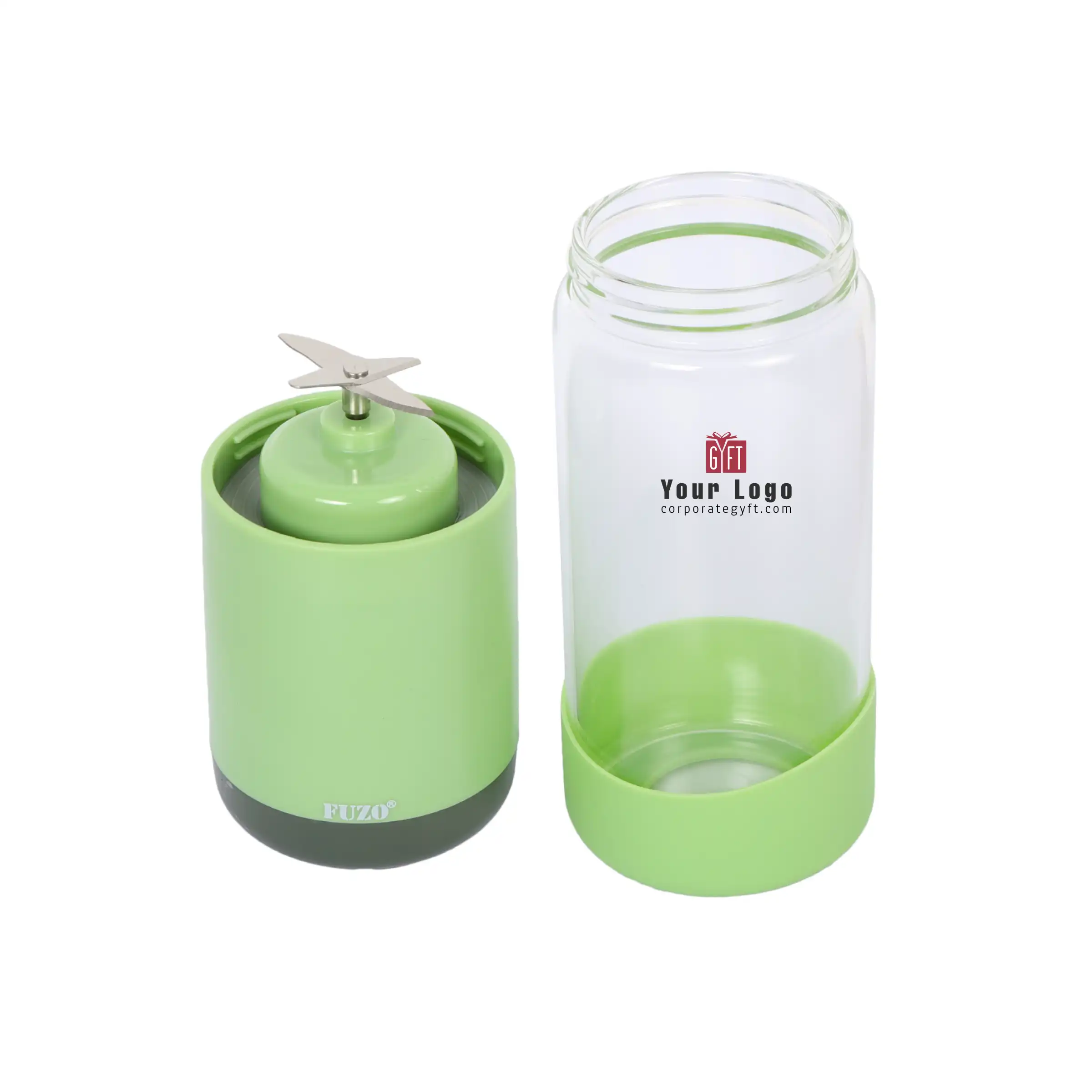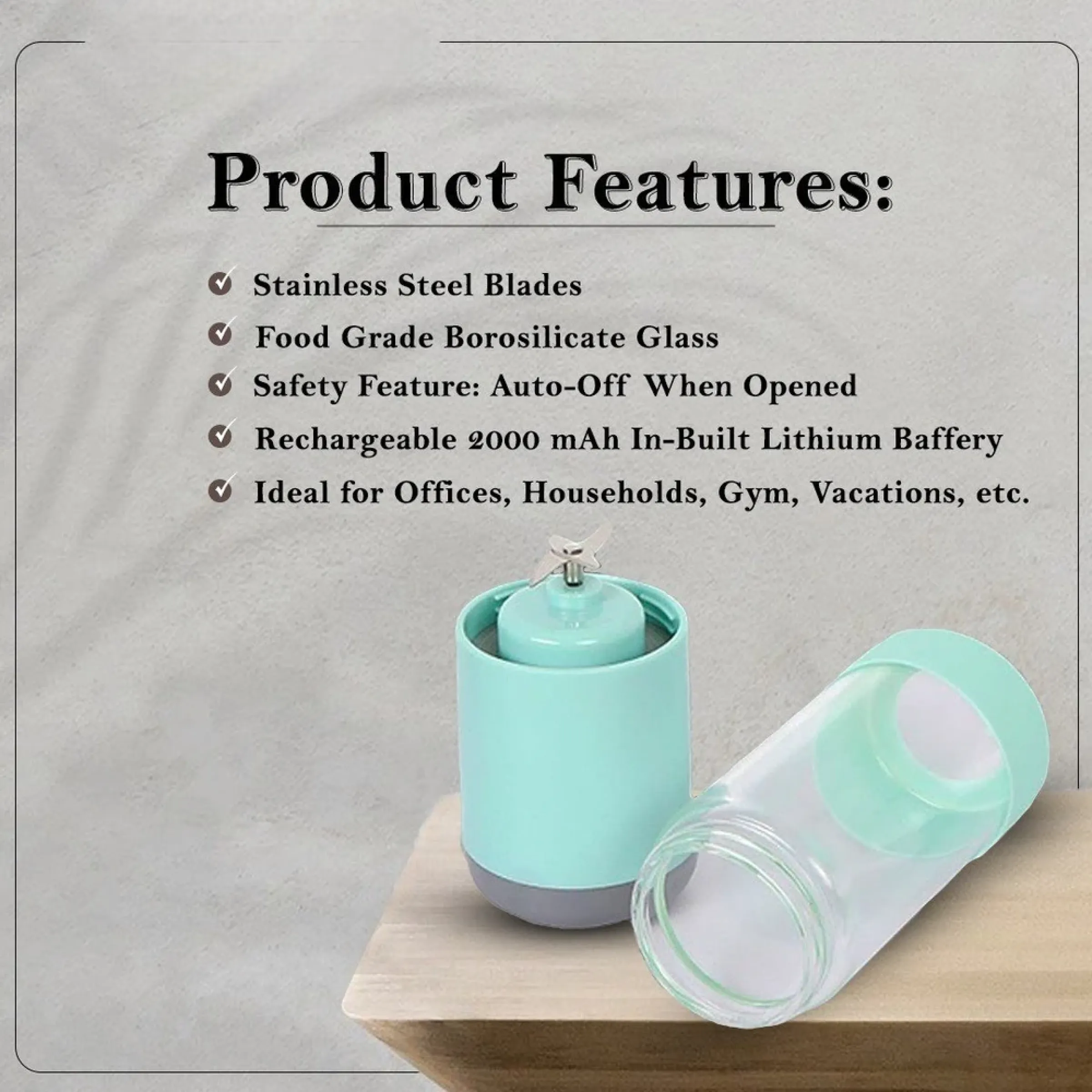 Blender designed in a compact 22×7 cm size using food-grade borosilicate glass, built to support convenient and healthy blending for everyday routines, powered by an in-built rechargeable lithium battery with a 2000 mAh capacity for cordless use, equipped with durable stainless steel blades for smooth and efficient blending, featuring a safety auto-off function when opened to ensure secure operation, integrated power button with charging socket for easy control and recharging, lightweight and easy to carry for flexible use across different settings, and finished with space available for custom logo and design printing, making it suitable for offices, households, gym use, vacations and premium corporate gifting.