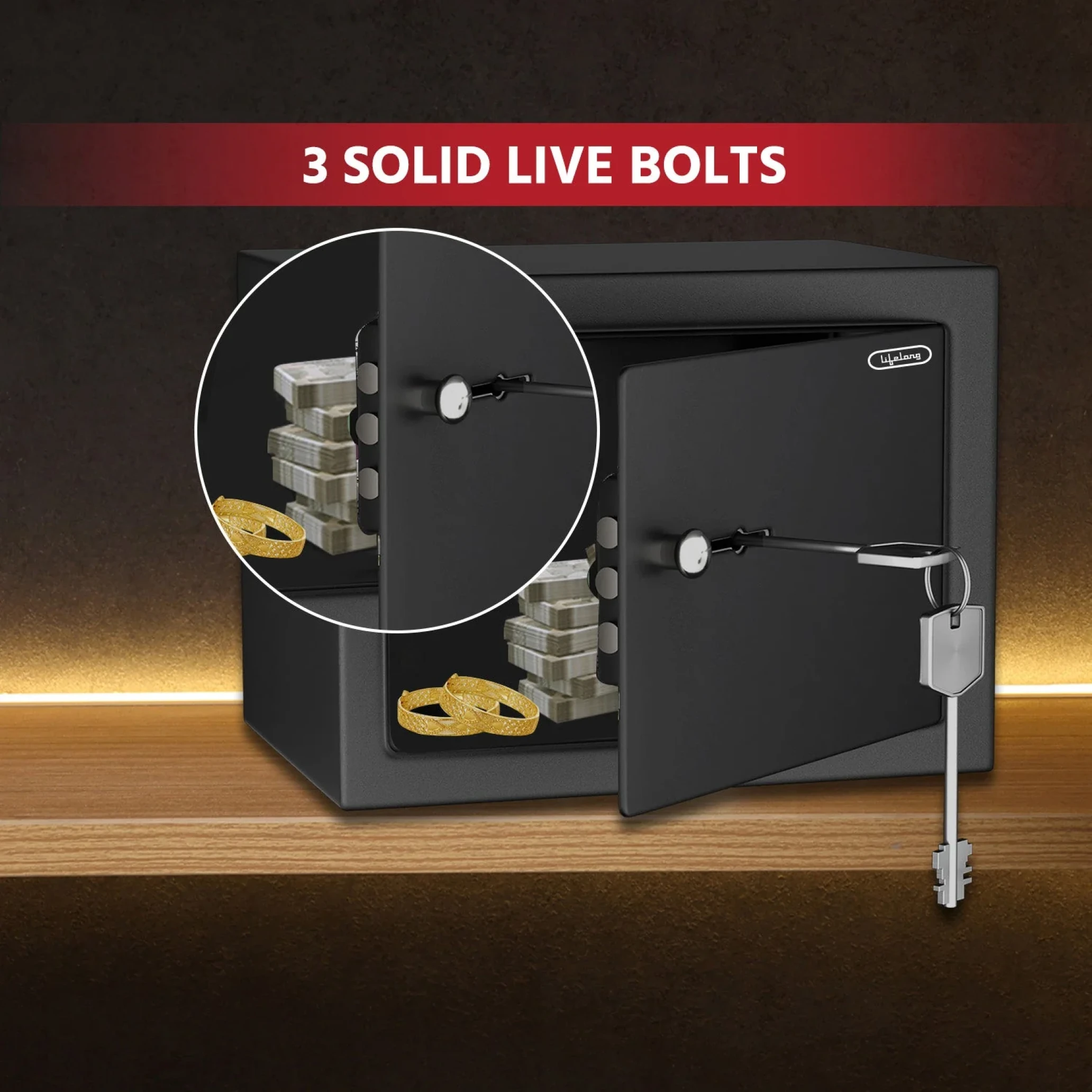 The lifelong home safe locker with key is a durable and compact security solution designed for storing jewellery, cash, documents, and other valuables. Built with heavy-duty carbon steel, a sturdy 5 mm metal door, and 3 solid locking bolts, it ensures reliable protection. With an 8.6 litre capacity, it is spacious enough for essentials while remaining portable and easy to install with floor mounting hardware. The in-built LED light enhances visibility, and the included keys, manual, carpet, and expansion bolts make it convenient to use. Perfect for home or office security, it also serves as a practical and thoughtful gifting option for weddings, housewarmings, festive occasions and corporate events.