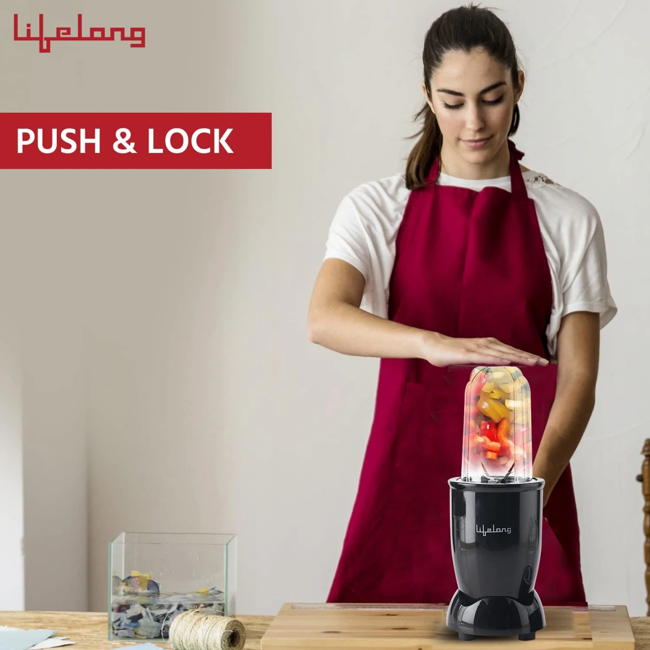The Lifelong regalia nutri mixer grinder blender is a compact yet powerful kitchen companion designed for everyday use. Equipped with a 450 w motor and stainless steel blades, it easily crushes fruits, vegetables, nuts, and superfoods to prepare smoothies, shakes, sauces, and nut butters with a smooth and consistent texture. The two unbreakable jars with a bullet-shaped design and twist extractor blades ensure quick and efficient blending. Easy to operate, detach, and clean, this appliance also features a safety lock for secure use. Its sleek black design makes it practical for daily nutrition and an ideal choice for gifting on weddings, housewarmings, or festive occasions.