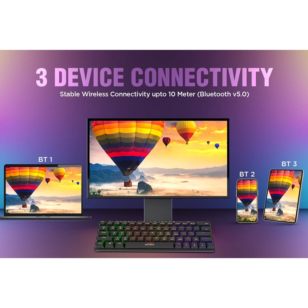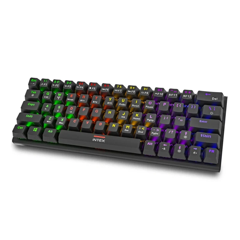 Designed for smooth performance and modern setups, the Intex original merchandise keyboard offers Bluetooth v5.0 wireless connectivity for fast and stable pairing along with seamless 3-device connectivity up to 10 meters, enabling effortless switching between devices, supported by a 2.4 GHz anti-interference nano receiver and streamlined wireless and wired linking for flexible use, equipped with a power on/off button, foldable foot support, and anti-ghost key functionality to improve comfort and typing accuracy, enhanced by adjustable brightness levels and dynamic RGB LED lighting with 20 modes for a premium visual experience, powered by a built-in rechargeable battery and conveniently charged using a detachable 1.5 meter Type-C cable, fully compatible with Mac, Vista, Windows 7/8/10, and Android OS, and featuring dedicated space for custom logo and design printing, making it ideal for office work, gaming, multitasking, presentations, and corporate gifting.