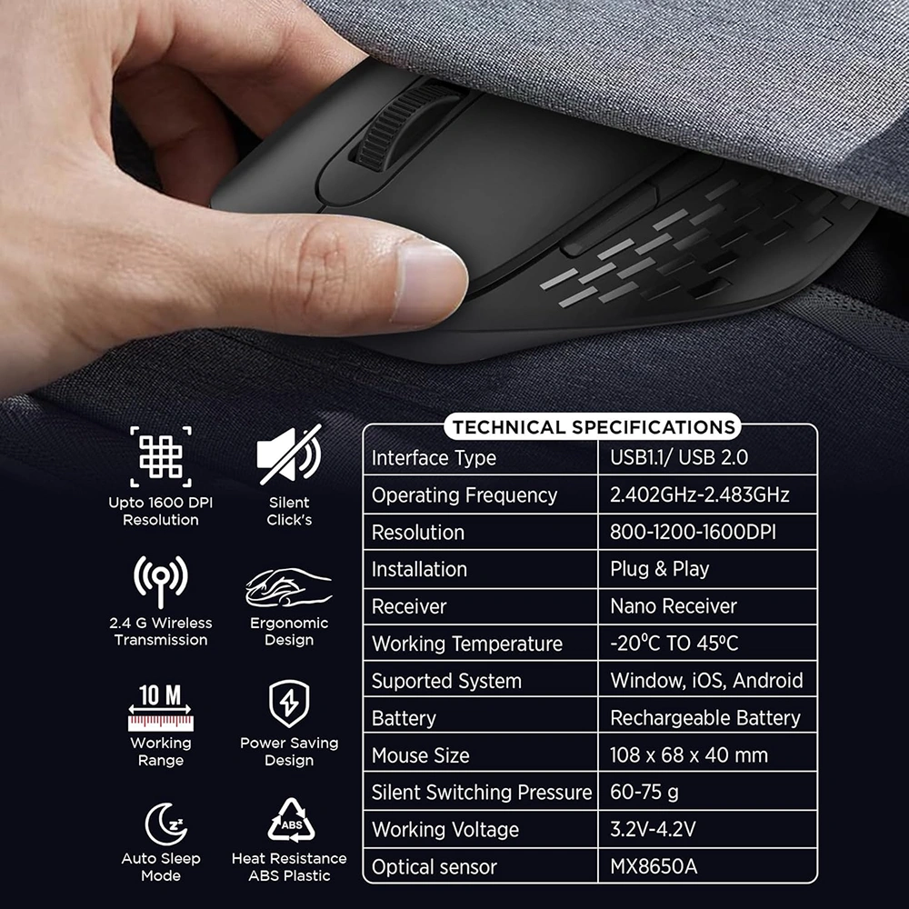 Designed for smooth performance and everyday reliability, the Intex wireless mouse combines a sleek, ergonomic form with durable heat-resistant ABS plastic to deliver comfortable use across long working hours. Supporting up to 1600 DPI resolution, it ensures precise cursor control for both work and casual tasks, while the 2.4 GHz wireless and BT 5.2 connectivity options offer flexible and stable pairing with laptops and desktops. The compact mini USB receiver enables quick setup and clutter-free operation, complemented by a working range of up to 10 meters for added convenience. Intelligent sleep mode and auto power shutdown help conserve energy and extend the long battery backup, making it ideal for uninterrupted productivity. With space available for custom logo and design printing, the mouse fits perfectly into professional environments, student use, and corporate gifting needs.