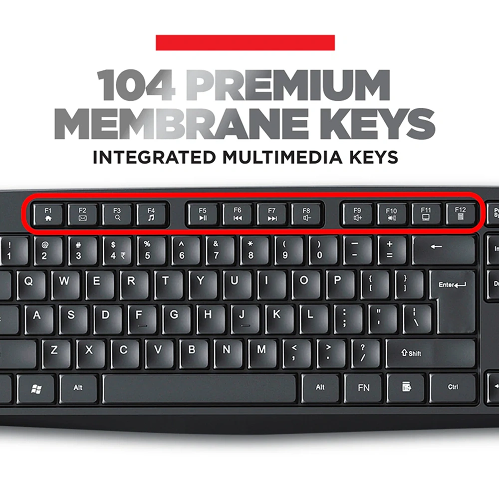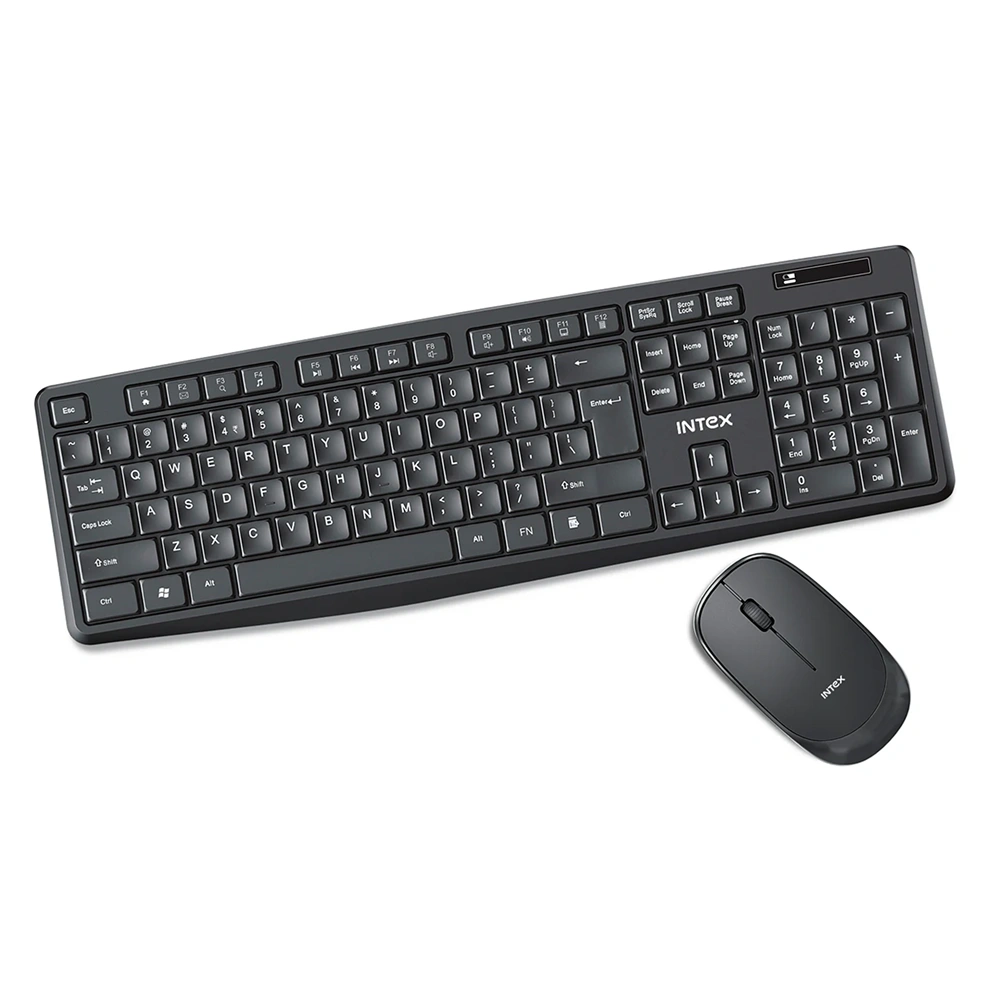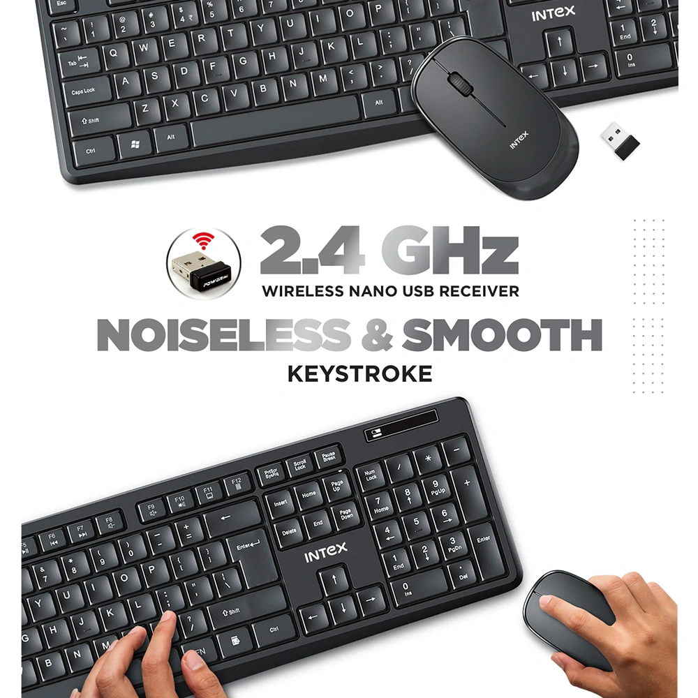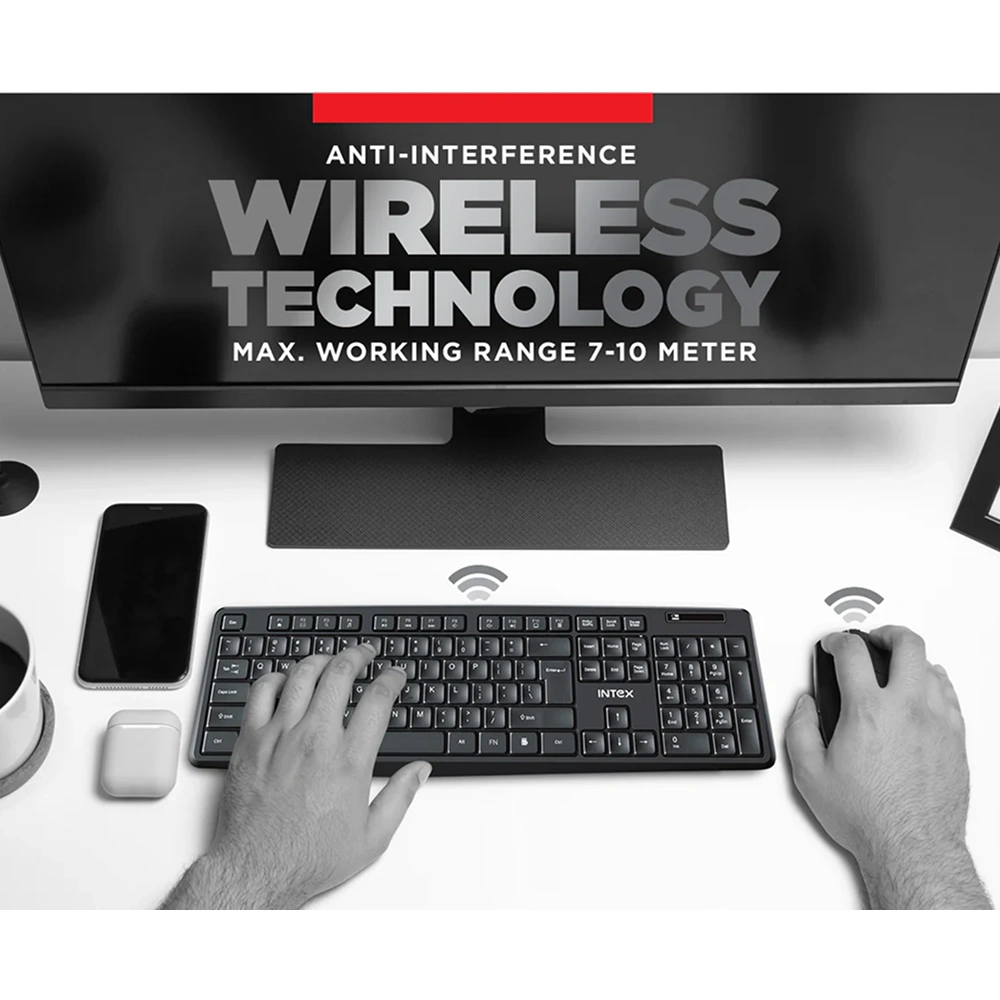 Designed to support seamless everyday computing with reliable wireless performance, the Intex keyboard and mouse combo delivers a clutter-free workspace through a 2.4G wireless connection using a single USB receiver for stable and responsive use. The full-size keyboard features 104 standard keys that ensure comfortable typing for long work or study sessions, complemented by 12 dedicated multimedia, internet, and office shortcut hotkeys that enhance productivity and quick access. With a dependable working range of 7–10 meters, the combo allows flexible positioning without signal drop, making it suitable for both home and office environments. The accompanying mouse is equipped with an optical sensor and adjustable DPI levels of 800, 1200, and 1600, offering smooth cursor control and accuracy across different usage preferences. Broad OS compatibility with Windows 98, Me, 2000, XP, Vista, 7, and Linux ensures versatile deployment across multiple systems. Space available for custom logo and design printing adds branding value, making the combo an effective choice for offices, home workstations, daily computing needs, study setups, and corporate gifting.