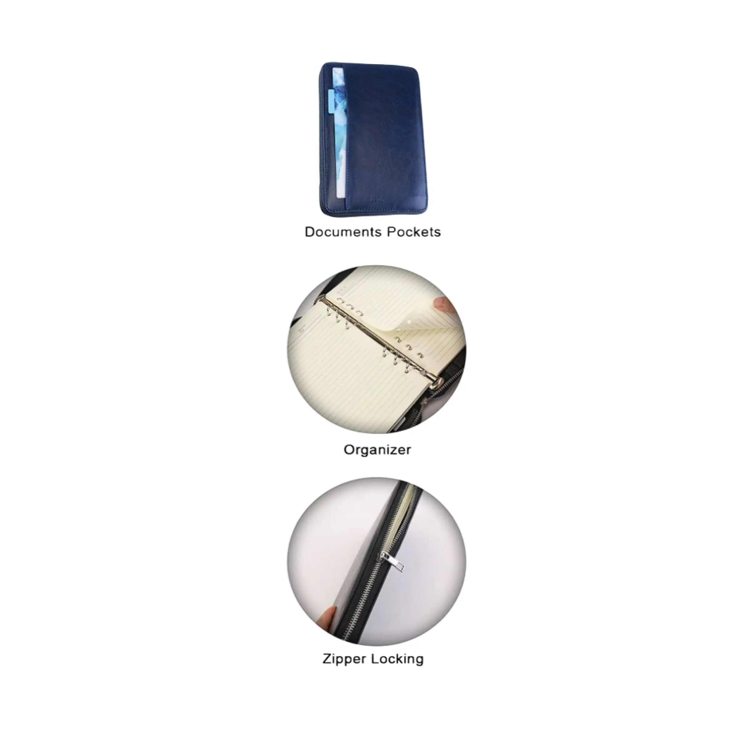 This premium leatherette zipped organizer is designed for professionals who value organization and style. Crafted with a durable leatherette exterior, it features a secure zipper closure to keep notes and documents protected. Inside, the organizer includes non-dated pages with smooth 80 GSM paper, making it suitable for flexible daily planning. Dedicated pockets neatly store cards and important documents, while the built-in pen loop ensures writing tools are always within reach. Its compact yet spacious design makes it ideal for meetings, travel, and everyday office use. Perfect as a functional work essential or a refined corporate gift.