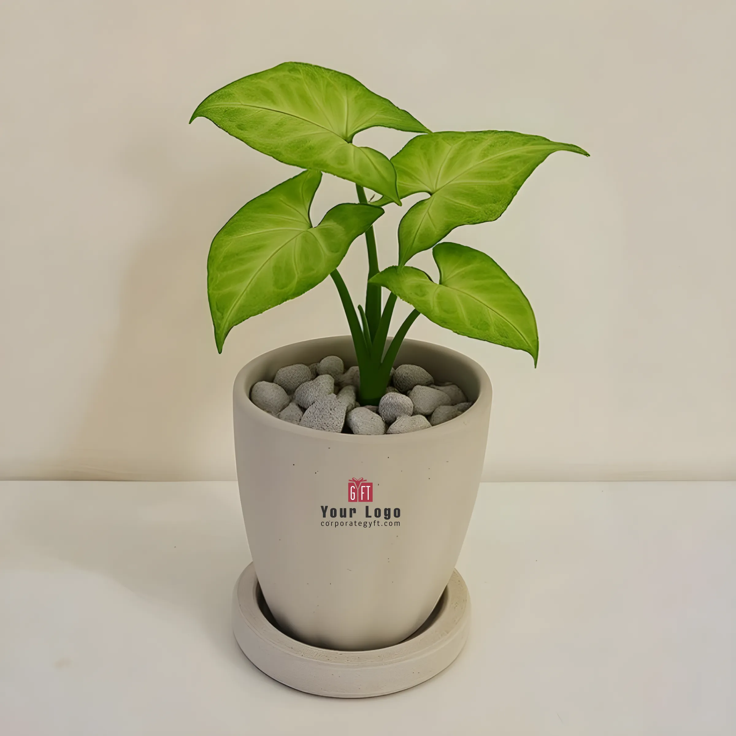 The Urban Upvan rice husk pot with Syngonium plant is a perfect blend of sustainability, style, and wellness. Crafted from eco-friendly rice husk material, the pot is lightweight, durable, and biodegradable, making it an environmentally conscious alternative to traditional planters. The Syngonium plant, known for its air-purifying qualities, adds a refreshing touch of greenery and improves indoor air quality naturally. Its compact 4-inch size makes it ideal for desks, shelves, reception areas, and small corners in homes or offices. Suitable for indoor and shaded outdoor placement, this low-maintenance plant thrives with minimal care, making it perfect for beginners and plant enthusiasts alike. The pot also offers space for custom logo or design printing, making it an elegant choice for corporate gifting, welcome kits, or thoughtful personal gifts.