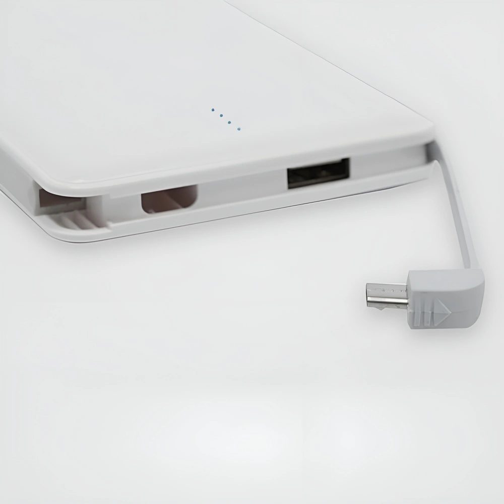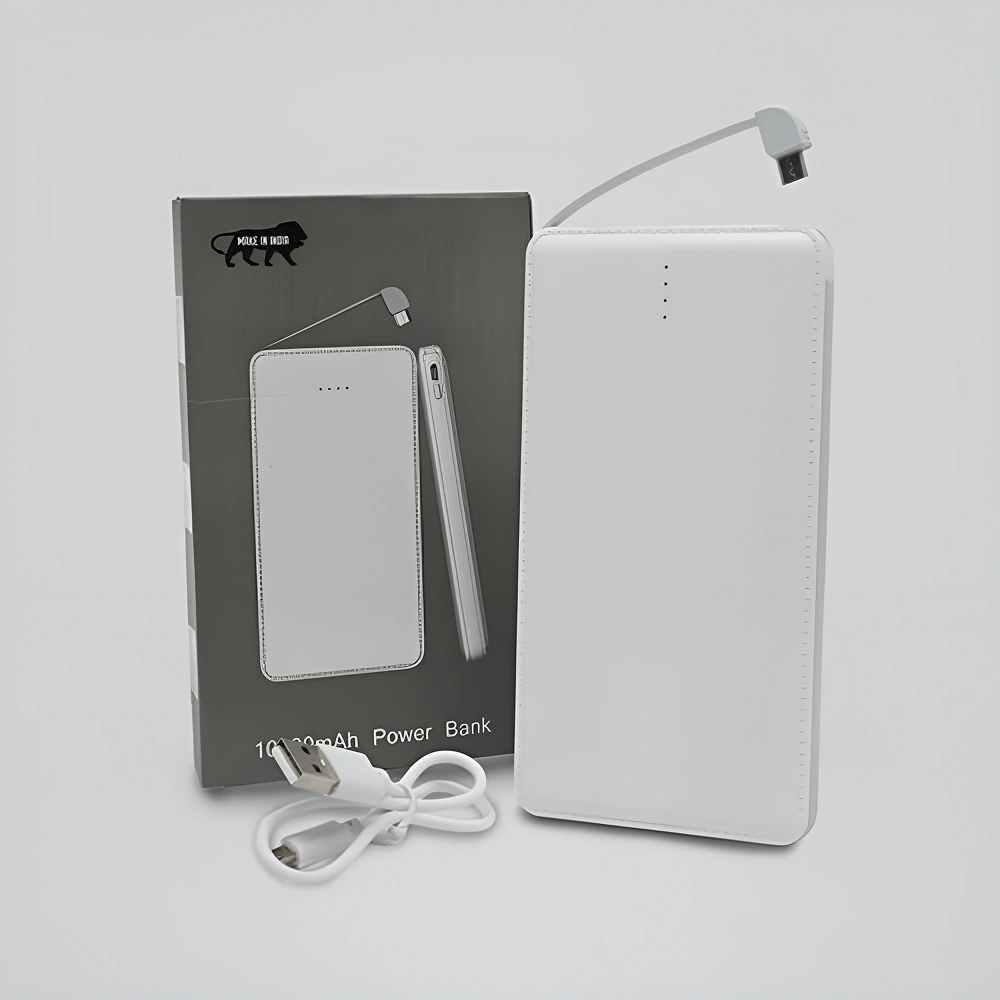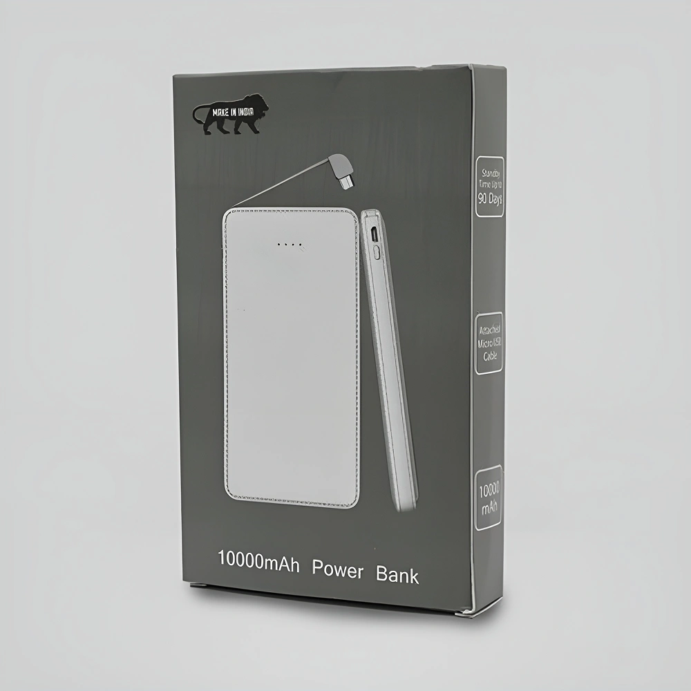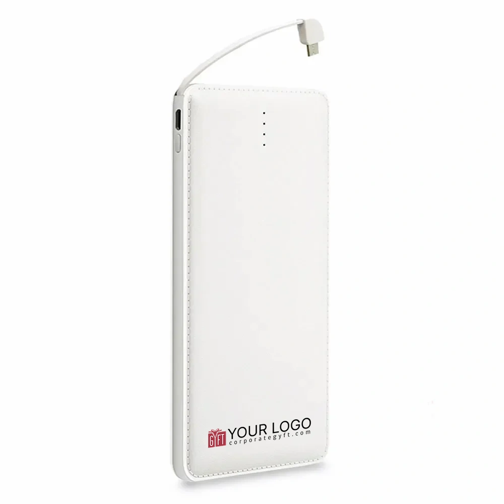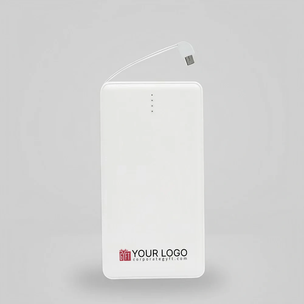 This power bank is a compact and reliable charging solution designed to keep devices powered on the go, featuring a 10000 mAh capacity that delivers dependable backup for smartphones and other USB-enabled devices, a USB output port for versatile charging compatibility, and a built-in charging cable that eliminates the need to carry extra wires, while its slim and lightweight body ensures effortless portability in bags or pockets, complemented by a 4-level LED power indicator that clearly shows remaining battery status, neatly packed in box packaging with a charging cable included, offering space available for custom logo and design printing, making it ideal for travel, daily use, office carry, corporate gifting and emergency charging needs.