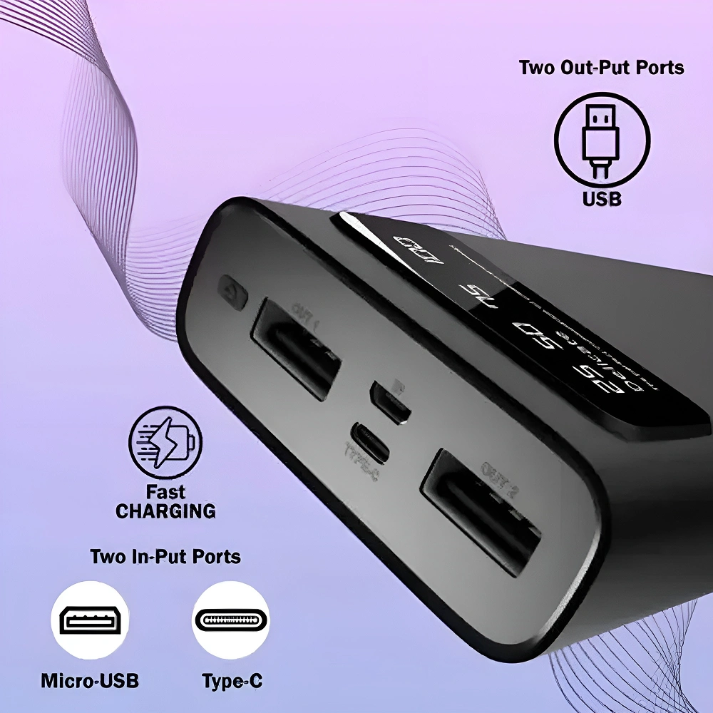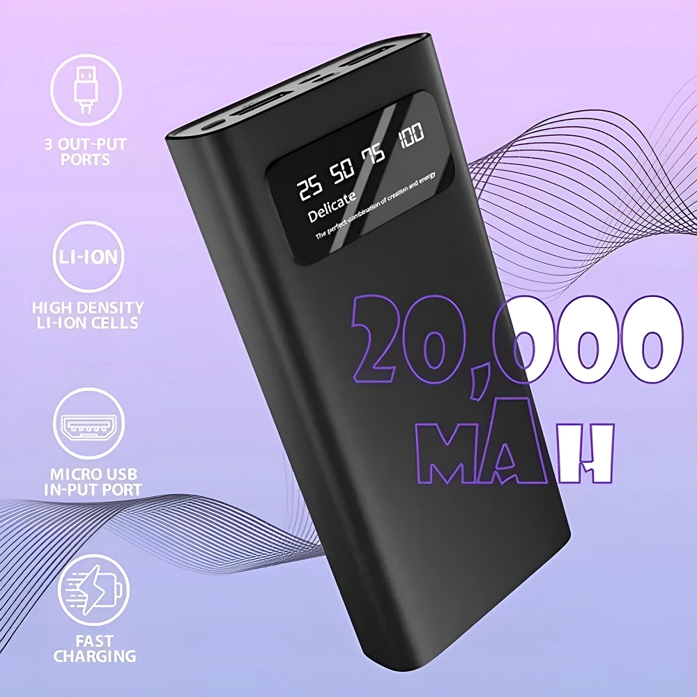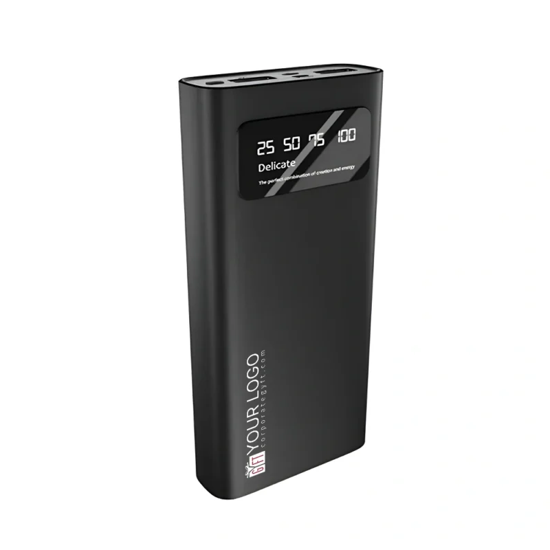 This high-capacity 20,000 mAh power bank is designed to keep your devices charged wherever you go. Built with high-density Li-ion cells, it provides reliable and long-lasting power for smartphones, tablets, and other USB-powered gadgets. The power bank features three USB output ports for charging multiple devices simultaneously, along with two input ports, Micro-USB and Type-C for flexible recharging options. A digital display shows the remaining battery percentage, allowing you to monitor power levels at a glance. Supporting fast charging for compatible devices, it ensures your gadgets are powered up quickly and efficiently. Its compact and portable design makes it ideal for daily use, travel, office carry, or as an emergency backup. With space available for custom logo and design printing, this power bank also makes a practical and thoughtful corporate gift.
