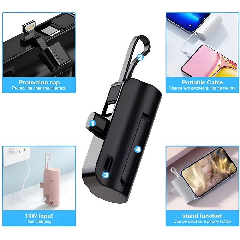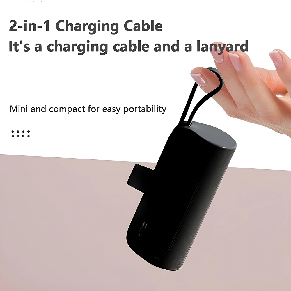 Designed for convenient everyday charging on the go, the power bank features a 10000 mAh capacity packed into a compact capsule-style body with an integrated lanyard that makes it easy to carry or attach, supports 10W power input through a Type-C port for efficient recharging, and includes a built-in charging cable along with a USB output to handle multiple device needs, thoughtfully designed with a charging connector protection cap for durability and a phone stand function that adds hands-free viewing convenience. At the same time, its mini size ensures effortless portability, offering space available for custom logo and design printing, making it suitable for daily use, travel, outdoor carry, corporate gifting and emergency charging.