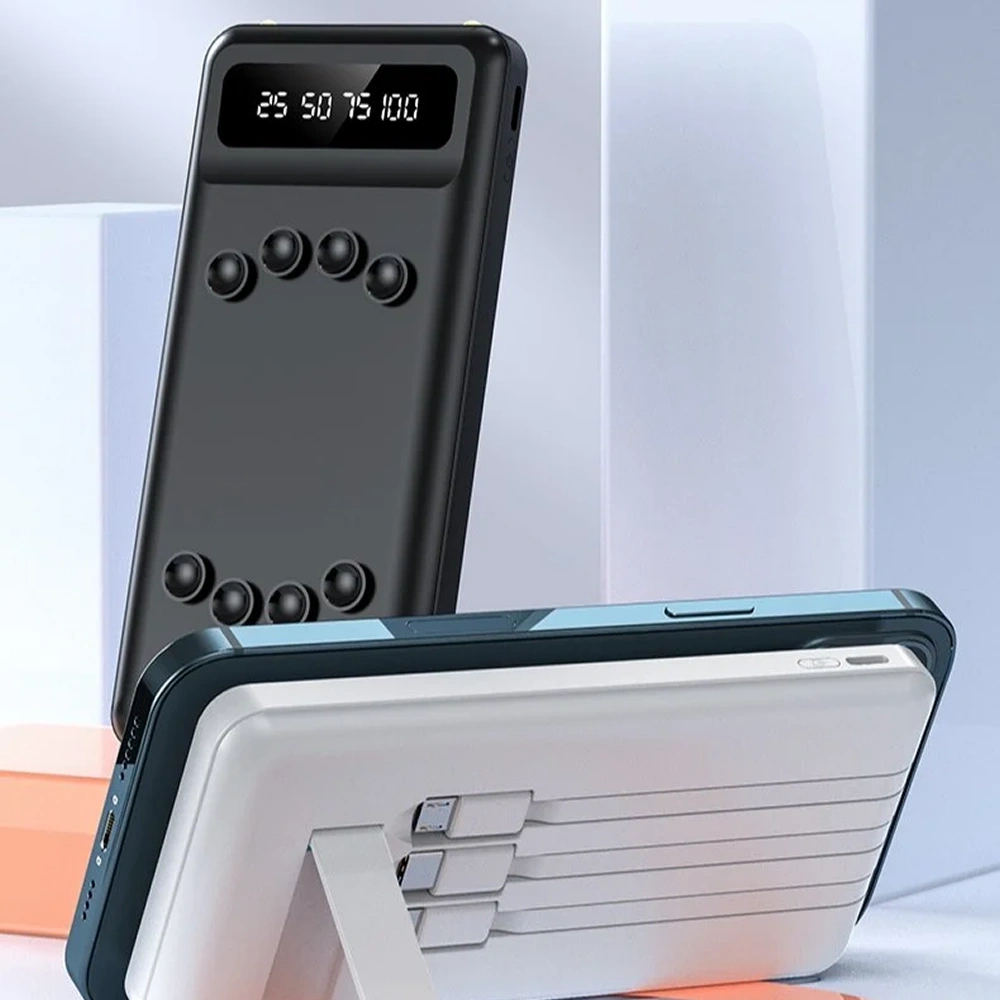 Designed to deliver convenient all-in-one charging on the go, the power bank features a 10000 mAh capacity powered by a high-density polymer battery for reliable everyday backup, housed in a compact rectangular body with rounded edges that is easy to carry, integrated with built-in multi-connector charging cables to reduce the need for extra cords, supported by a clear digital LED battery status screen for quick power checks, and enhanced with an integrated phone stand that allows comfortable content viewing while charging, offering space available for custom logo and design printing, making it suitable for daily use, travel, office carry, content viewing, and emergency charging needs.