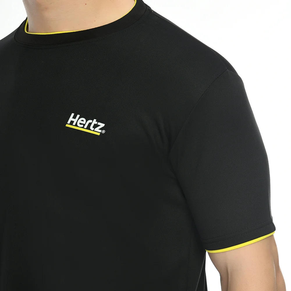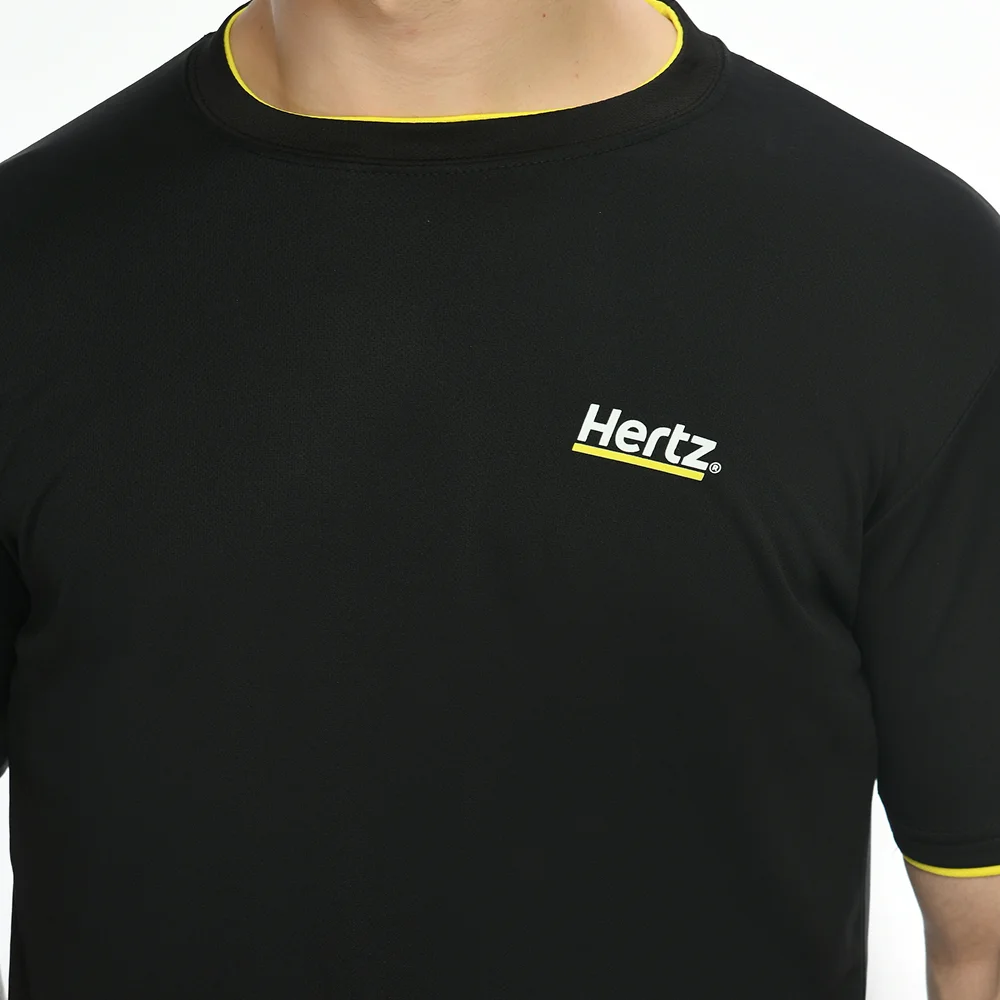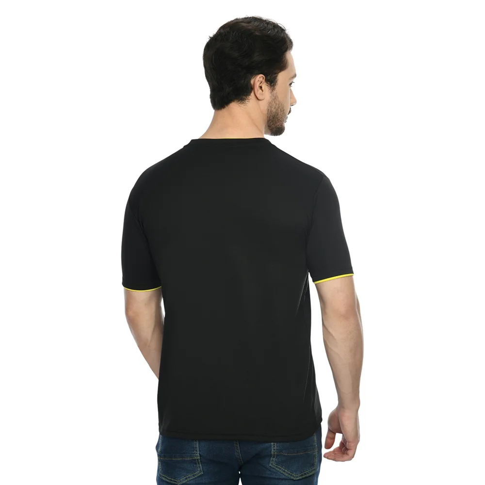 Bold black mesh t-shirt delivering sweat absorbent comfort with high contrast yellow trim