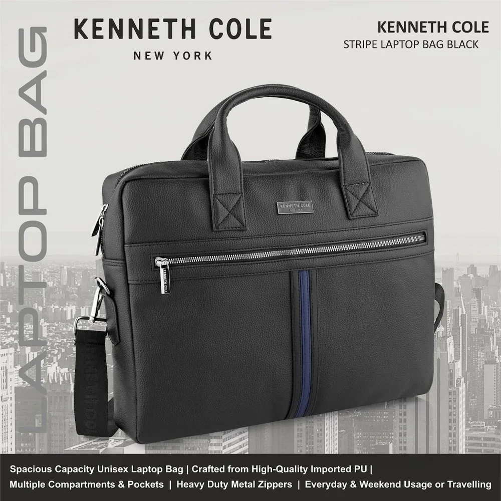 The Kenneth Cole stripe laptop bag in black combines style with functionality for modern professionals. Crafted from high-quality imported PU leather, it features a distinctive stripe design that stands out. Multiple compartments and pockets keep your laptop and essentials organized, while heavy-duty metal zippers ensure durability. Spacious and versatile, it is ideal for everyday use, office, travel, or weekend trips. A practical and stylish choice for yourself or as a thoughtful gift.