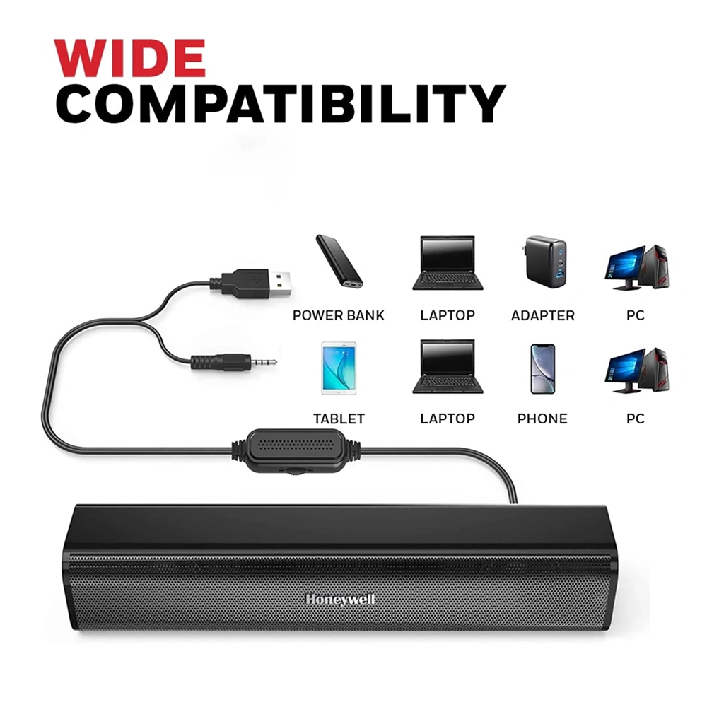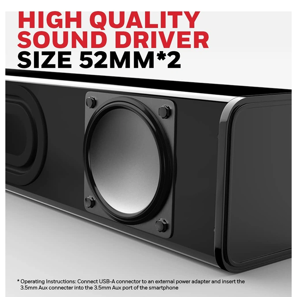 Compact and efficient, this wired soundbar is designed to deliver clear and balanced audio for everyday use. With a 10 W output and 2.0 channel stereo sound powered by dual 52 mm drivers, it ensures an immersive listening experience for music, videos, and more. The simple plug and play setup allows easy connection via USB for power and 3.5 mm AUX for audio, making it compatible with laptops, desktops, tablets, and smartphones. A smooth volume control button offers convenient sound adjustment, while its lightweight and space-saving design fits perfectly on any desk. Finished in a sleek black glossy look, it adds a modern touch to your setup. Built with reliable performance features like 4Ω impedance and a wide 20 Hz to 20 kHz frequency range, it is ideal for daily entertainment and work needs.