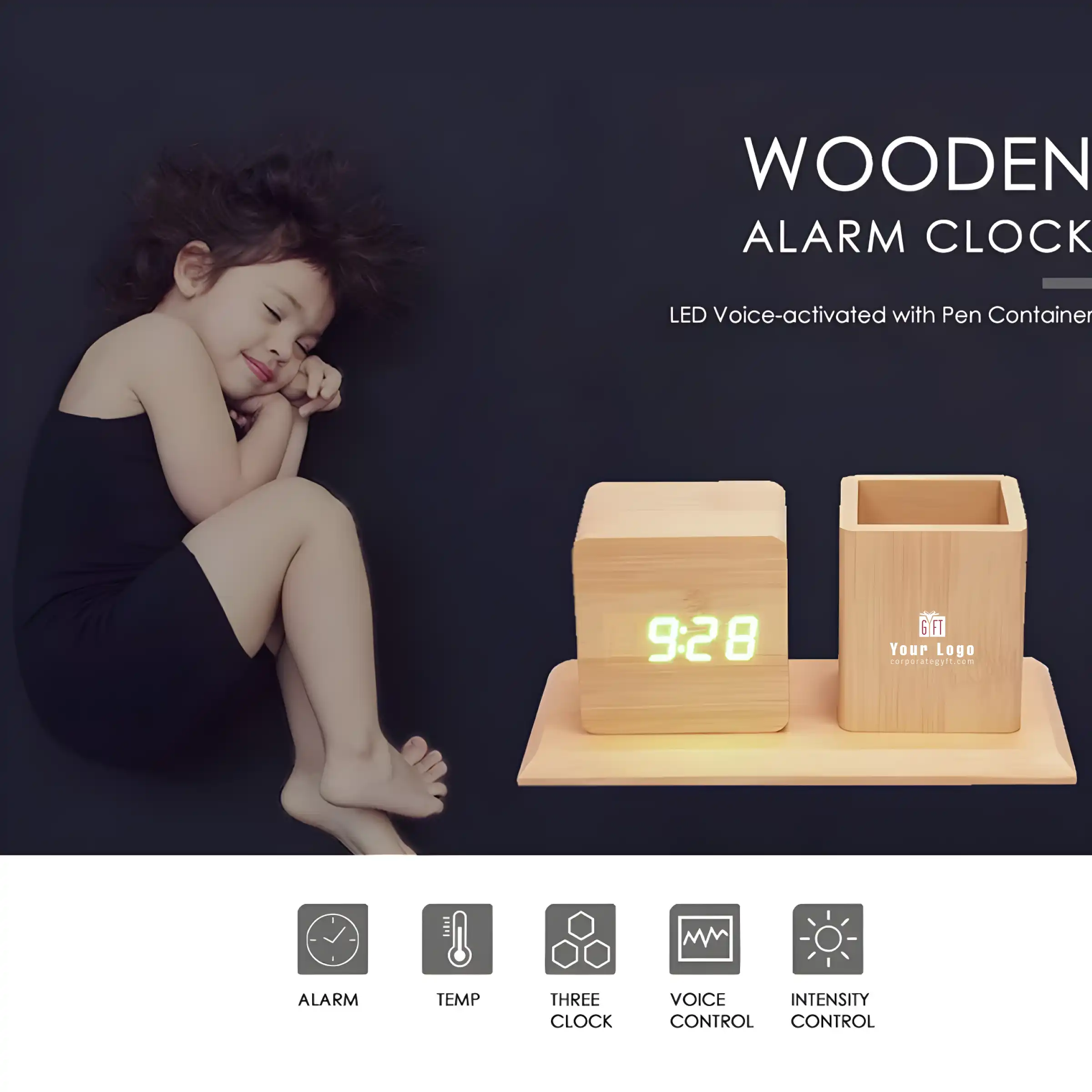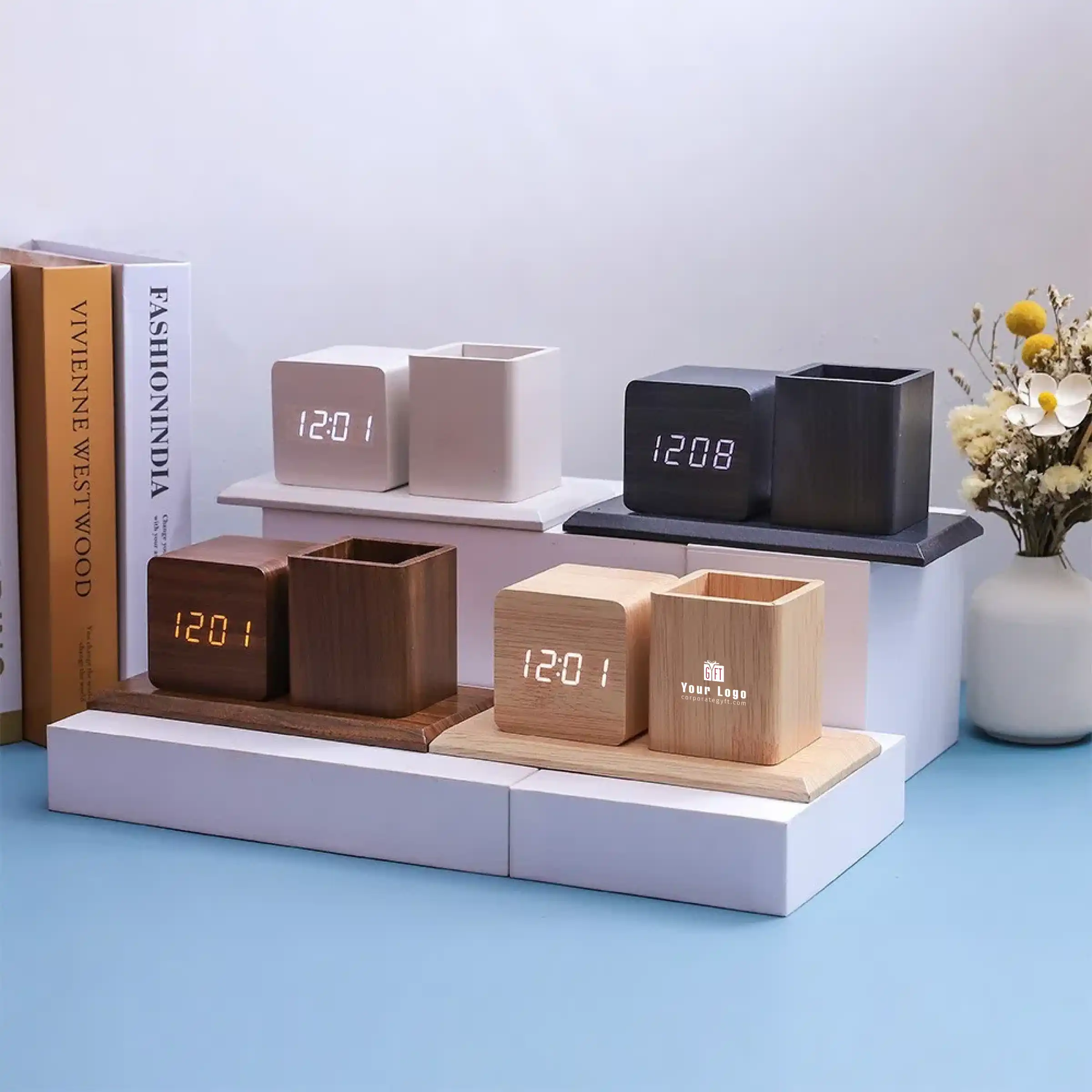 Smart wooden desk clock with LED display and pen holder for home and office setups