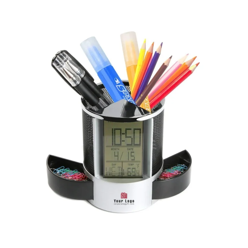 This multifunctional LCD pen stand clock is designed to keep your desk organized while giving you all essential information at a glance. The clear display shows time, date, day, and temperature, making it perfect for daily use at home or in the office. Its cylindrical mesh design provides ample space for pens, markers, clips, and other stationery, ensuring a clean and tidy workspace. The built-in alarm with snooze adds extra convenience, while the battery-powered setup ensures easy placement anywhere. A smart and stylish desk accessory ideal for students, professionals and corporate gifting.